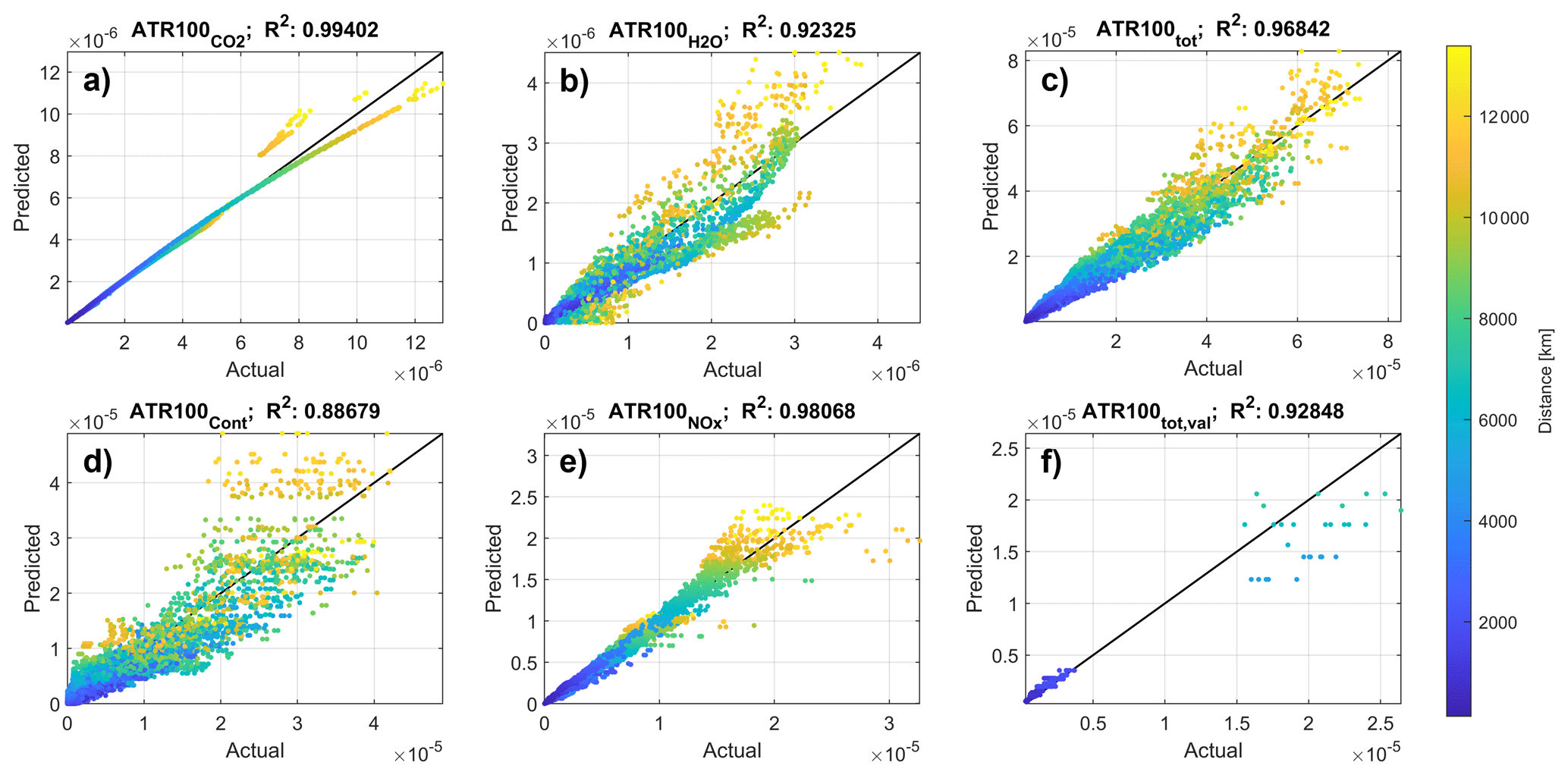Figure 9For Multiple Regression, correlation of estimated ATR100 of CO2- (a), H2O- (b), NOx-emissions (e) and produced contrails (d) with the AirClim estimates (referred here as to “actual”), as well as the ATR100tot-estimation for the dataset (c) and a validation dataset (f). The color code indicates the flown distance.