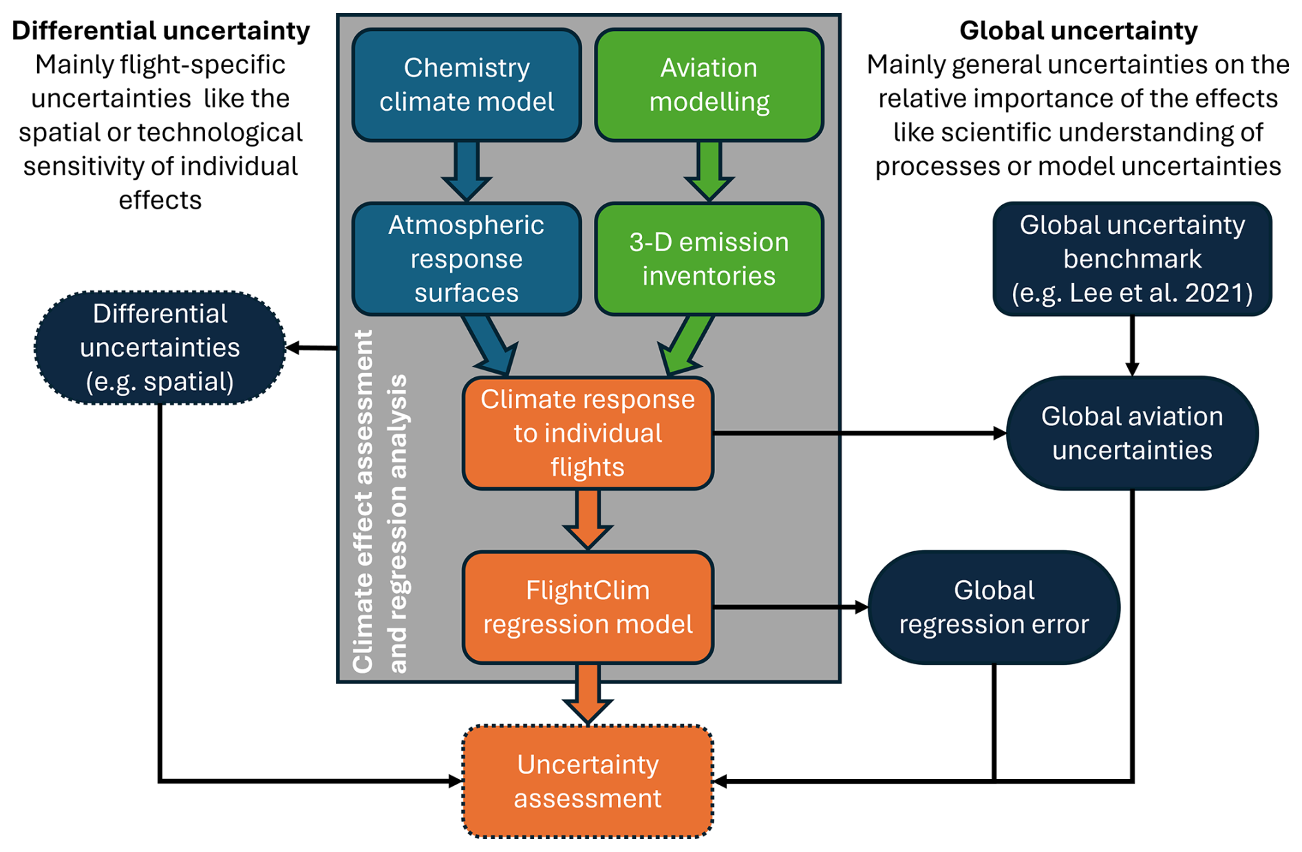 Clearly, aviation non-CO2-effects are subject to large uncertainties. The uncertainties regarding the climate effect of individual routes as described here, are likely to be even larger than those for the global average. Here we conceptually (and mathematically) distinguish between uncertainties in the importance of individual aviation effects that are globally applicable (global uncertainty) and the sensitivity of these effects to certain influences like location or aircraft technology (differential uncertainty). This discrimination is shown in Fig. 11 that describes a full approach in assessing uncertainties in the climate effect of individual flights estimated with FlightClim. Figure 11 is based on the high-level modeling workflow of FlightClim as illustrated in Fig. 1 (grey box).