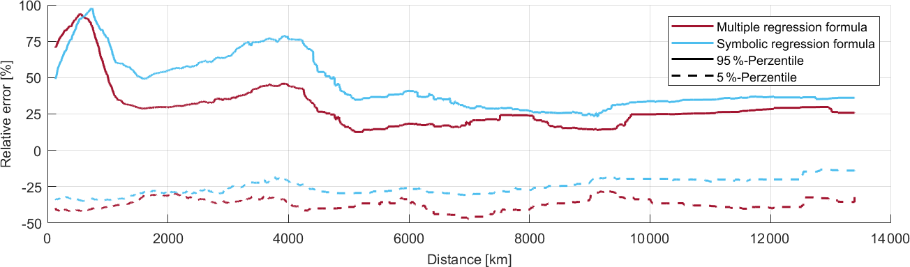 The second part of global uncertainties of the FlightClim estimates is the regression error, which adds on the before described uncertainty of the regression database. In this section we expand the analysis on the regression error from Sect. 3.4, where the MARE and R2 of the two applied regression approaches, MR and SR was discussed. To analyse the uncertainty of the regression the 90 % confidence interval of the relative error of the total ATR100 FlightClim result is calculated based on all flights in the regression dataset. Figure 12 shows that the 95 %-percentile varies over the length of flights for both regression approaches in a similar manner. The percentiles vary for short- (< 1000 km) medium- (1000–4500 km) and long-range (> 4500 km) flights (see Table 2). While short-range flights have a larger confidence interval of the relative error of roughly 40 % to 80 %, the others are mostly in the range of ±1/3.