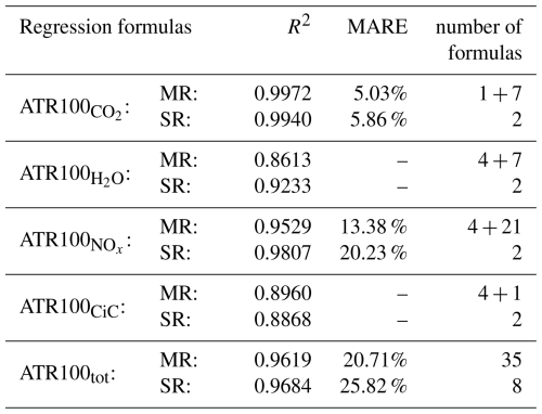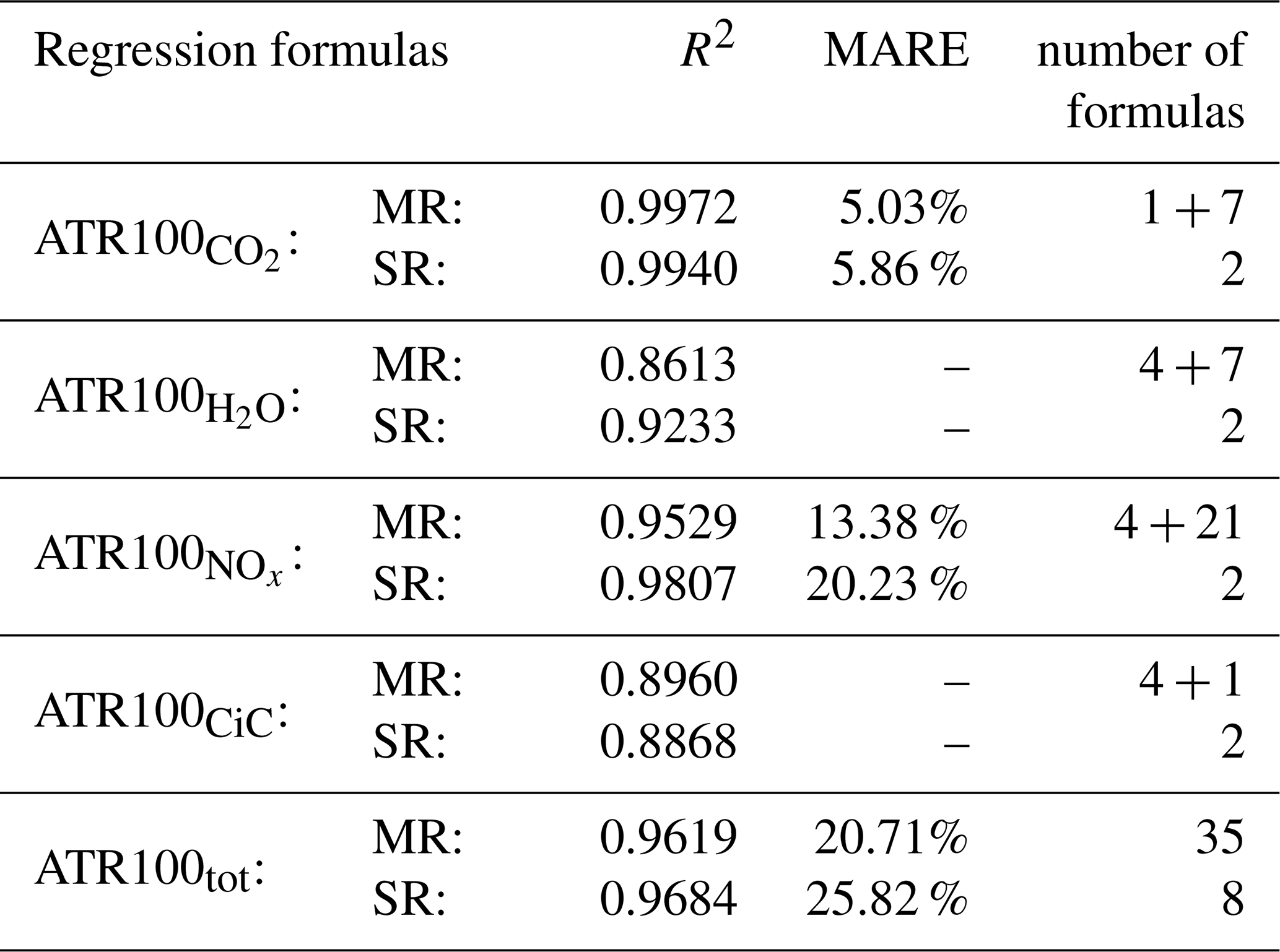 Table 1Comparison of Multiple Regression and Symbolic Regression formulas for the estimation of the climate effect of individual flights. Quality of fit is quantified by R2 and MARE. Due to zero or almost zero values in the dataset MARE is not defined for ATR100H2O and ATR100CiC. The number of formulas is counted before smoothing. The first value is the number of formulas for the climate effect estimation and the second for supporting equations like the fuel and NOx-regressions.