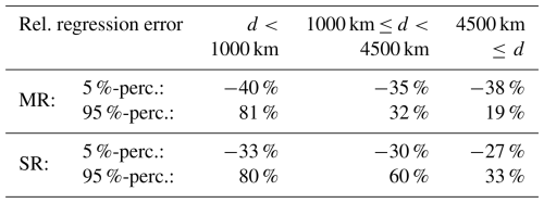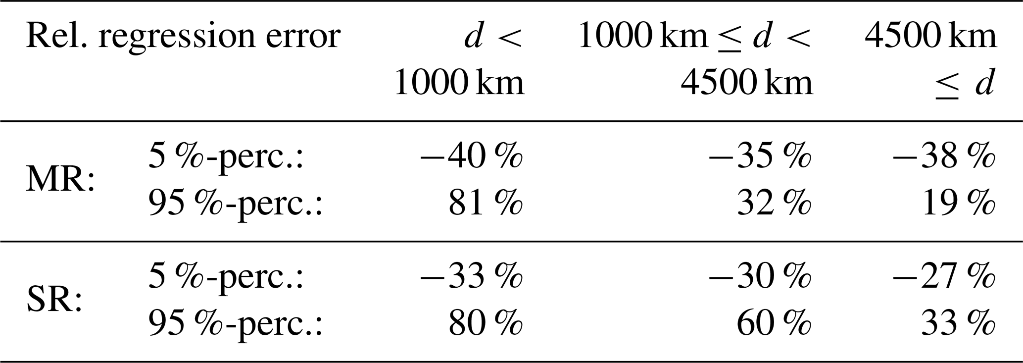Table 2Confidence interval (90 % ranging from the 5 %- to 95 %-percentile) for both regression approaches (MR & SR) in terms of the relative regression error for the estimated total ATR100 sectioned according to great circle flight distance d.