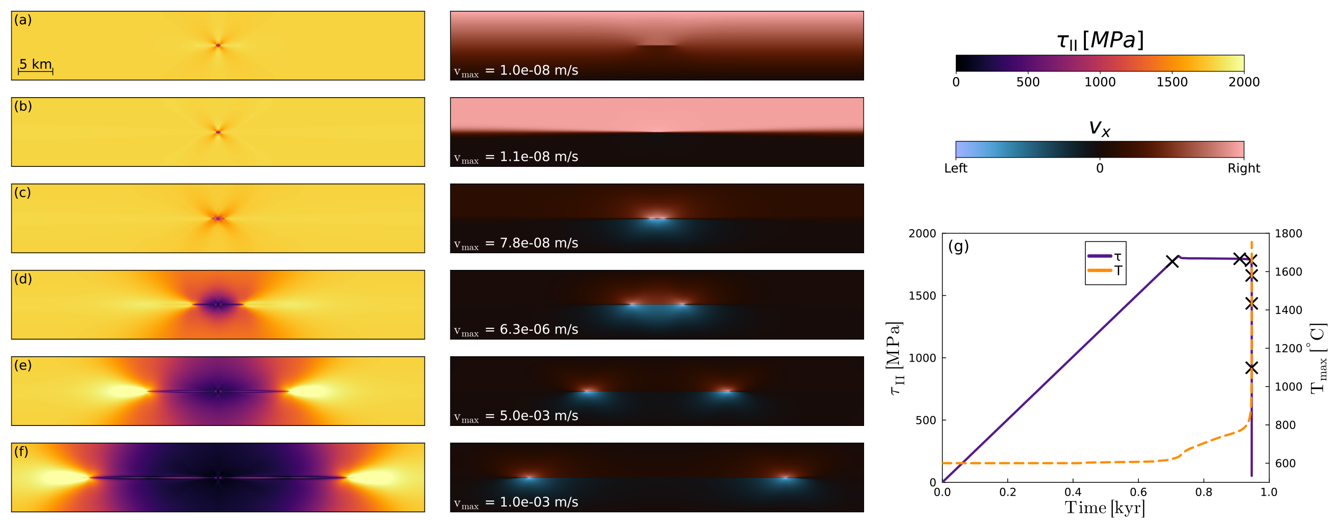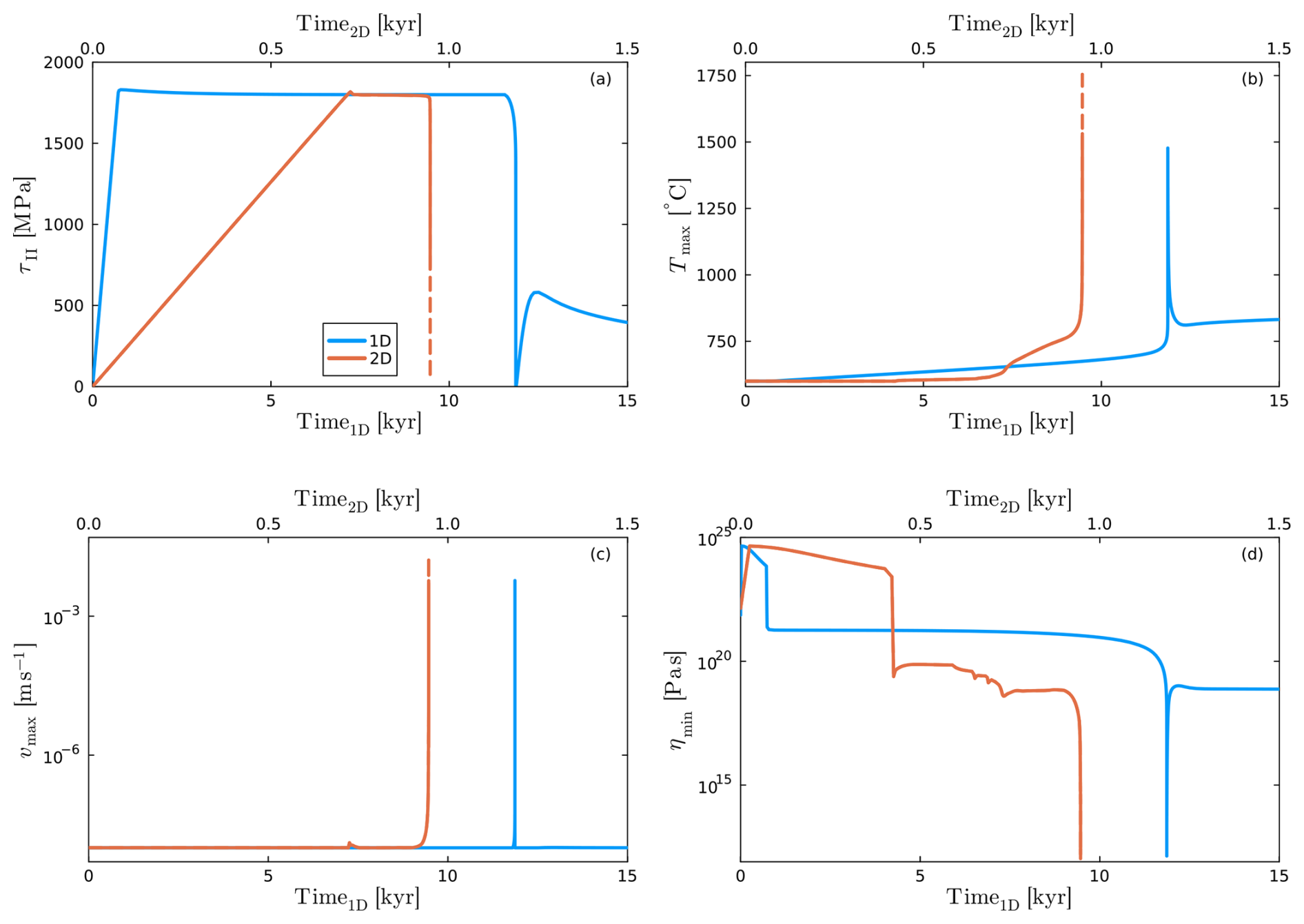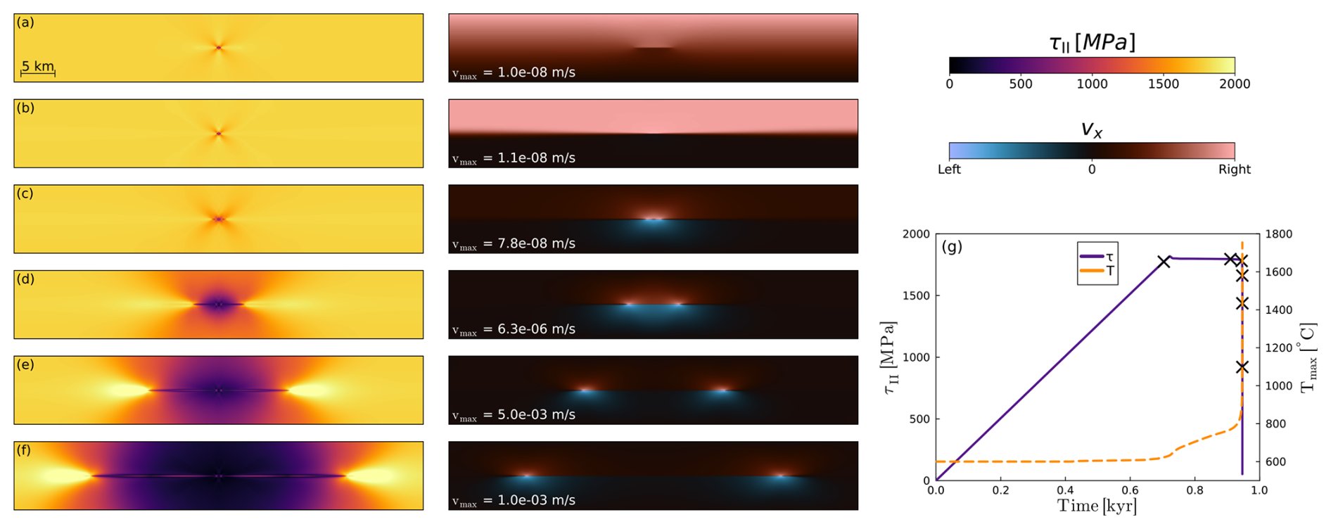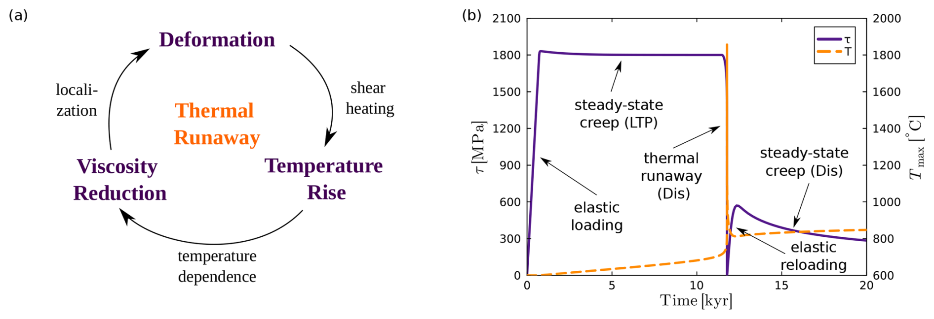 In Spang et al. (2024), we captured the dynamics of thermal runaway using a one-dimensional, visco-elastic thermomechanical simple shear model, which predicts the temporal evolution of stress and temperature within an evolving shear zone (Fig. 1b). The model evolves through five distinct stages: (i) elastic loading, during which deviatoric stress increases linearly while temperature remains constant; (ii) steady-state viscous creep, dominated by low-temperature plasticity (LTP), where stress remains nearly constant and temperature increases steadily; (iii) thermal runaway, in which deformation localizes into a narrowing slip zone dominated by dislocation creep, leading to a significant stress drop and an exponential increase in temperature; (iv) post-runaway loading, characterized by linear stress increase as heat diffuses from the shear zone into the surrounding host rock; and (v) post-runaway creep, where temperature is large enough for dislocation creep to gradually relax stress as the system transitions into a stable sliding regime.
