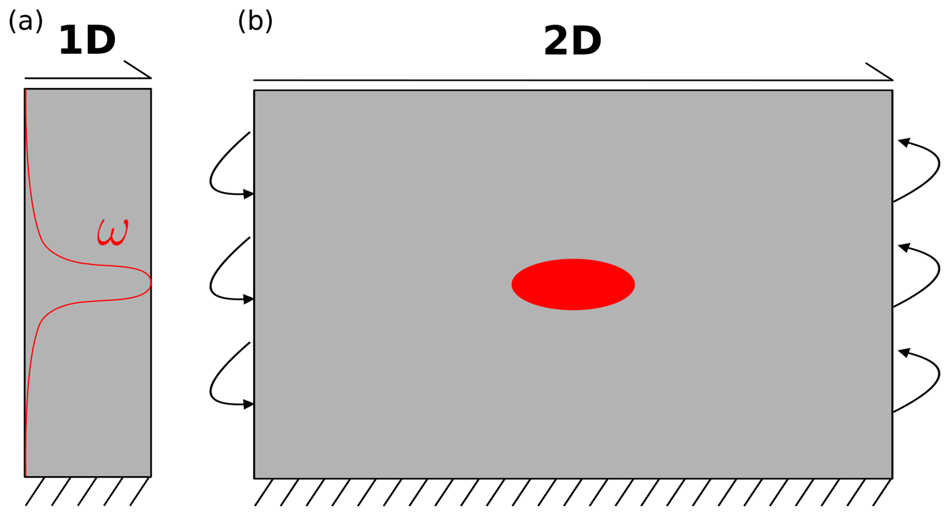Figure 2Model setups with simple shear boundary conditions. (a) 1D model. Note that the model only has a single cell in the horizontal direction. The red line indicates the distribution of the weakening factor ω. (b) 2D model. The red ellipse indicates the weak inclusion where the weakening factor ω is applied. Lateral boundaries are periodic. Both setups are not drawn to scale. Vertical extent is 10 km for both models and horizontal extent is 60 km for the 2D model. Adapted from Spang et al. (2024, 2025a).