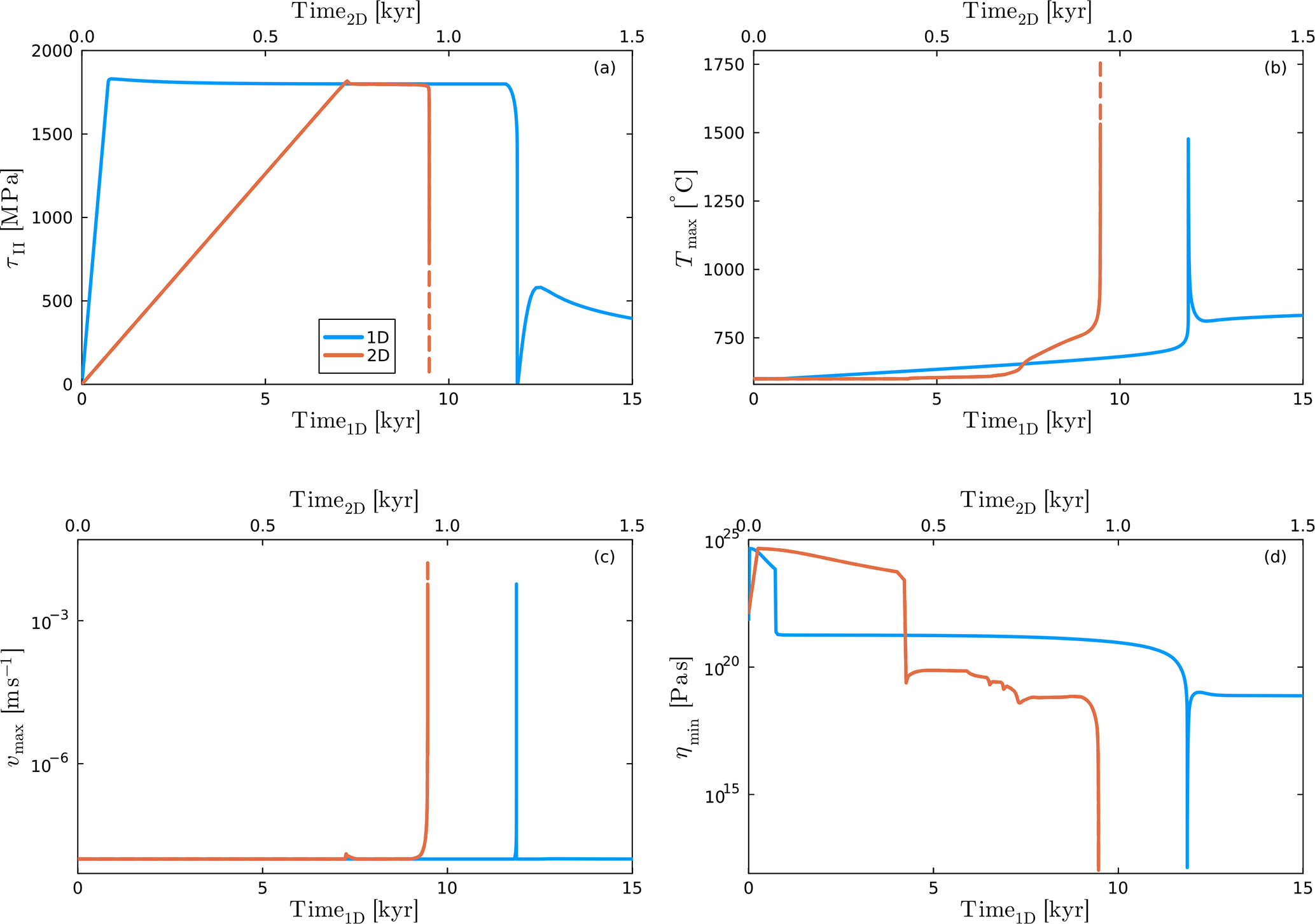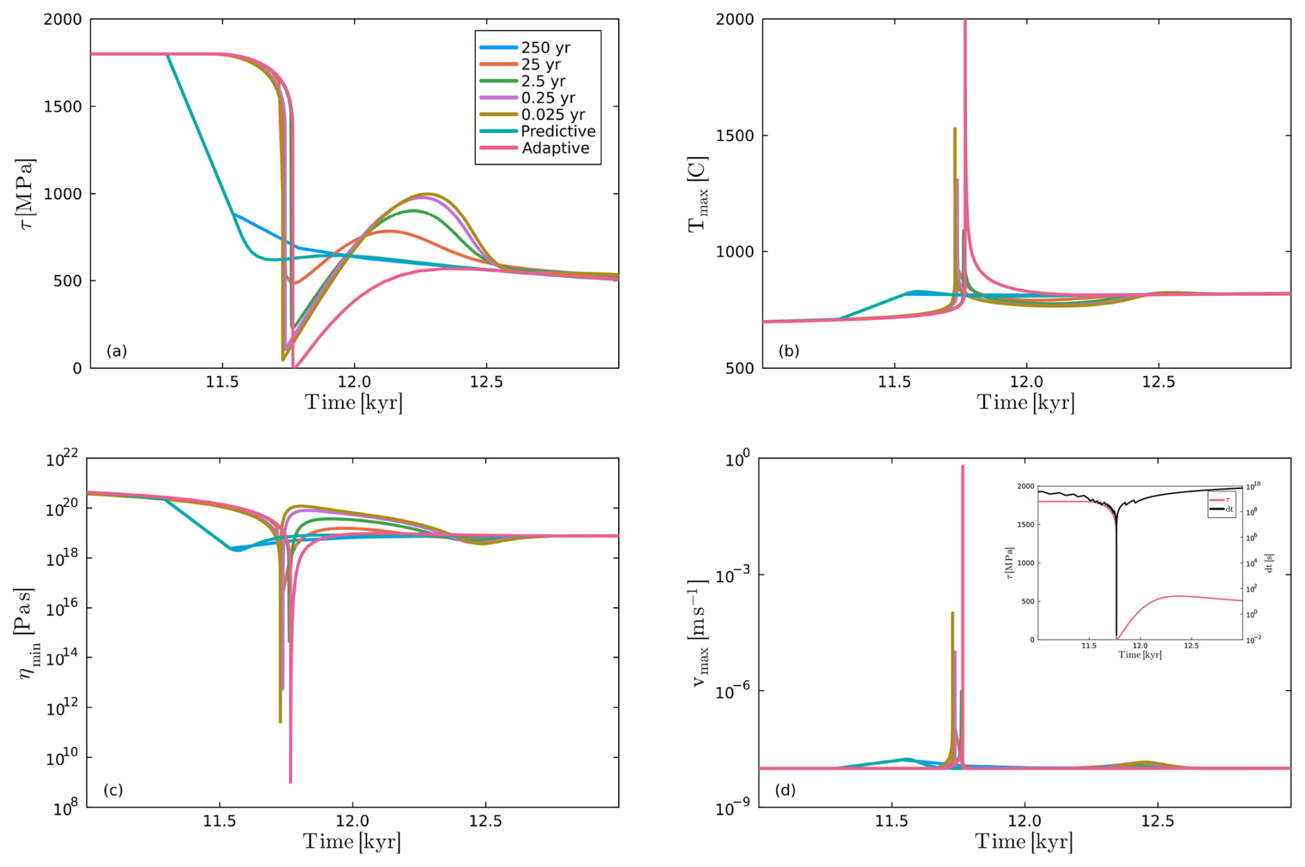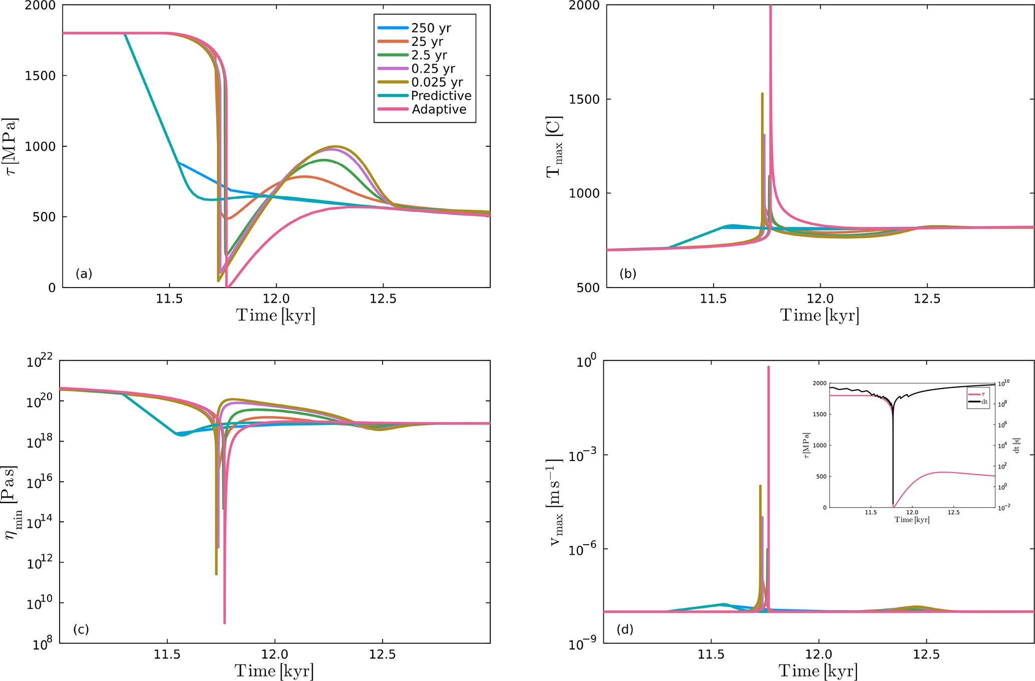 The inset in Fig. 3d illustrates the performance of this method. The time step initially remains on the order of hundreds of years during the steady-state creep phase, drops by approximately two orders of magnitude as stress begins to relax, and then decreases by another ten orders of magnitude during the onset of thermal runaway. In the elastic reloading phase, Δt quickly recovers to hundreds of years as both stress and temperature evolve more slowly.