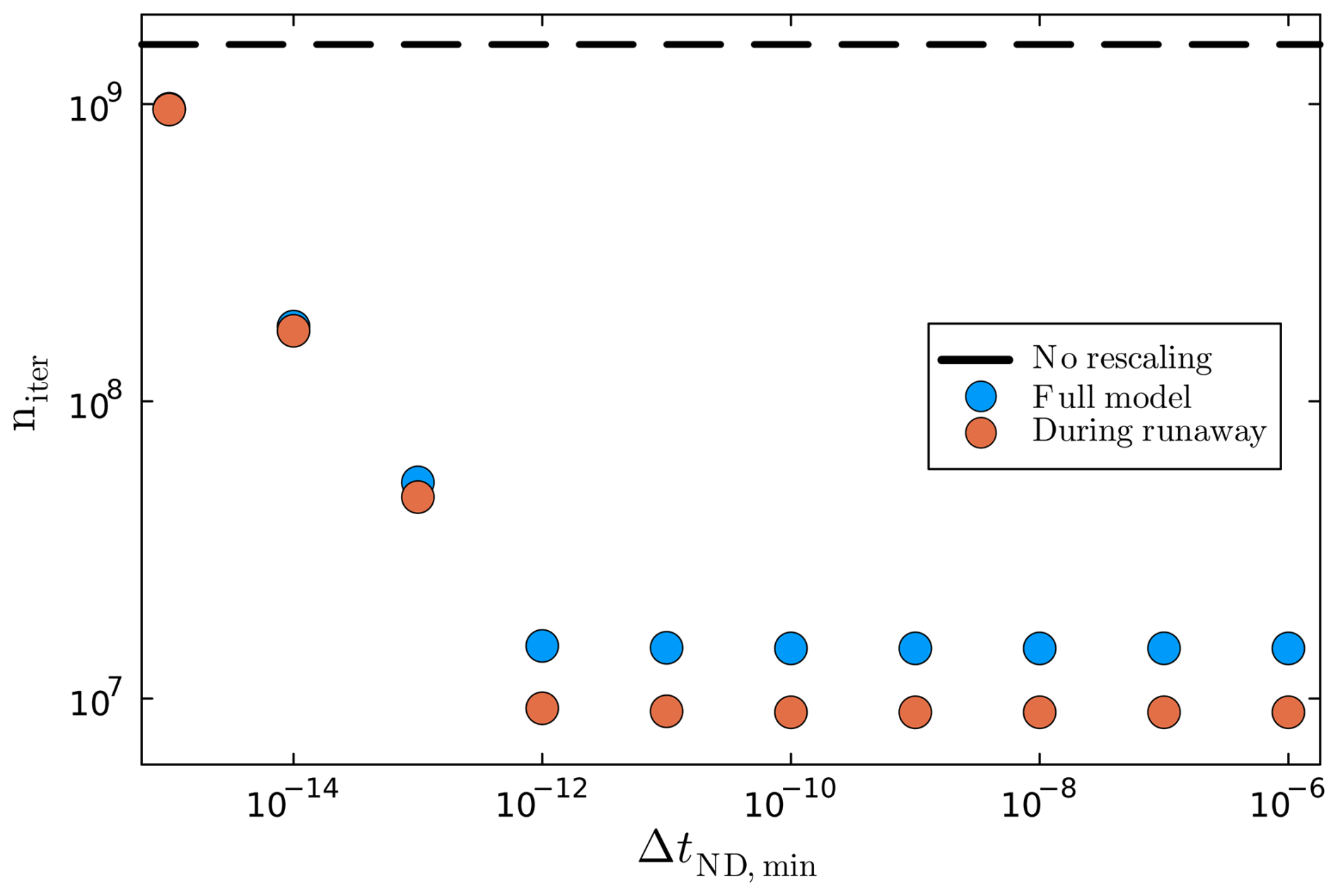 In Fig. 4, we demonstrate how rescaling facilitates convergence and reduces the number of iterations by two orders of magnitude for a model that takes time steps as low as 25 µs. Without rescaling, the model requires about 2×109 iterations in total to solve, the majority of them during thermal runaway. Rescaling properties with time scales in their units as soon as the nondimensional time step ΔtND drops below 10−14 reduces the number of iterations by one order of magnitude. Rescaling at reduces the total number of iterations by another order of magnitude, and only half of them are used during the runaway. Further reduction of the critical ΔtND has only negligible effects (Fig. 4) despite the proximity of the values to numerical precision.