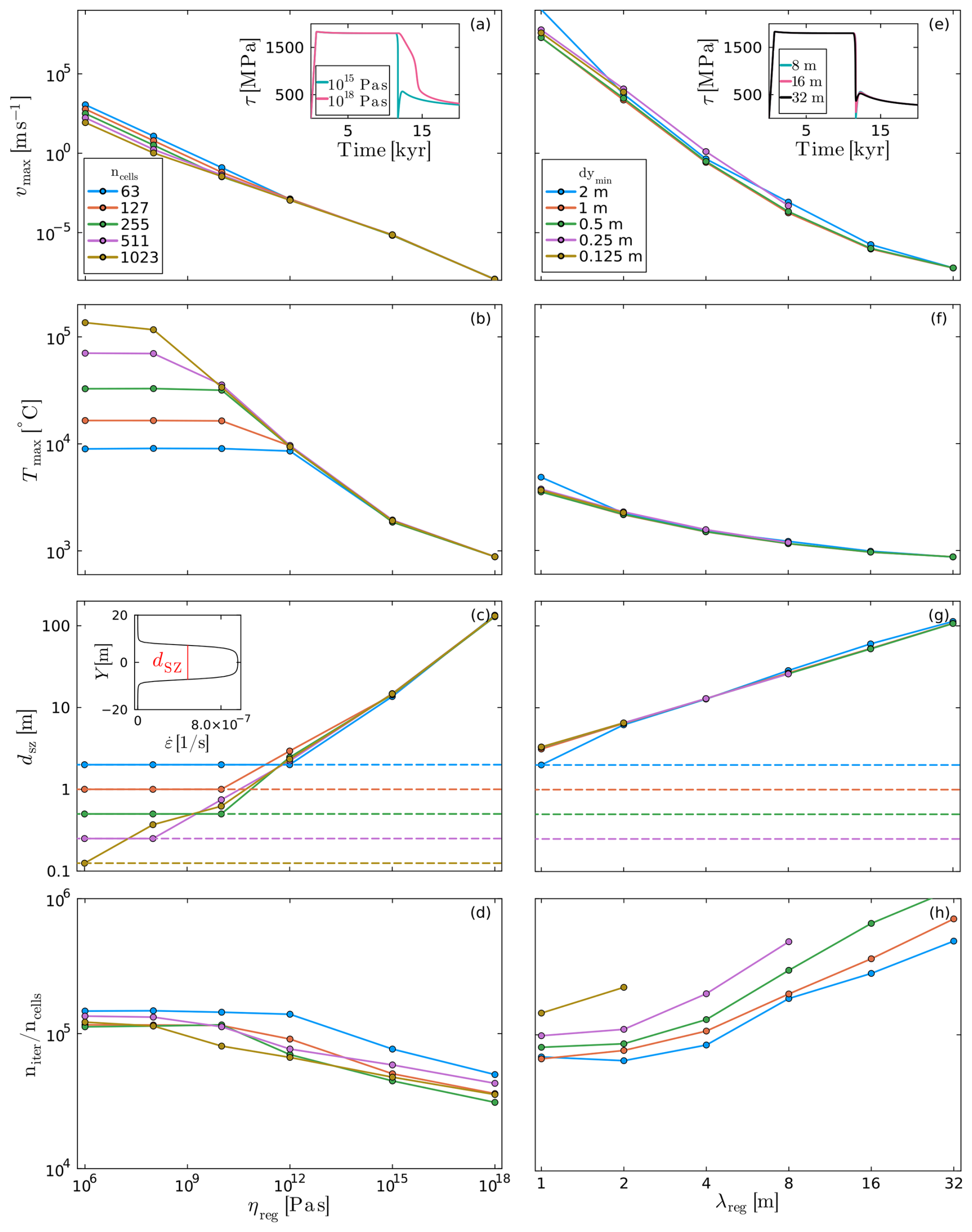 Figure 5Effect of viscosity regularization (left column) and gradient regularization (right column). Colors correspond to resolution (number of cells and corresponding size of smallest cell) and all axes are logarithmic. (a, e) Maximum velocity. (b, f) Maximum temperature. (c, g) Shear zone width (full-width-half-maximum of strain rate peak, see inset). Dashed lines indicate size of one cell for each resolution. (d, h) Total number of iterations divided by number of cells. Insets in (a) and (e) show stress evolution for 255 cells and largest . All models with lower values are indistinguishable from the displayed ones.