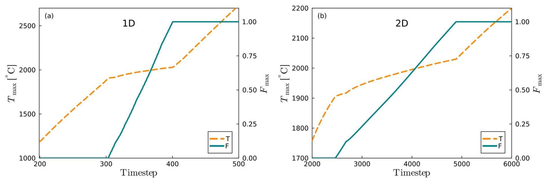 where Fit and Fit−1 are the melt fraction in the current and previous iteration, respectively, Ft is the target melt fraction according to the melting model, and is a relaxation factor.