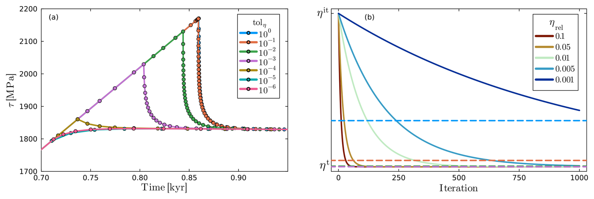 In the iteration-adaptive scheme, we also use Eq. (32) to predict the new time step. However, instead of applying it only once at the beginning of a physical time step, we dynamically adjust the time step during every iteration of the APT solver. This approach enables rapid reduction of the time step by several orders of magnitude within a single physical time step, while still adhering to the constraints set by Δτmax and ΔTmax. However, as the elastic component of the strain rate is time step-dependent (Eq. 7), adapting the time step during PT iterations can lead to unstable behavior where the residuals oscillate and fail to converge. As this method is unstable, we did not plot it in Fig. 3a.