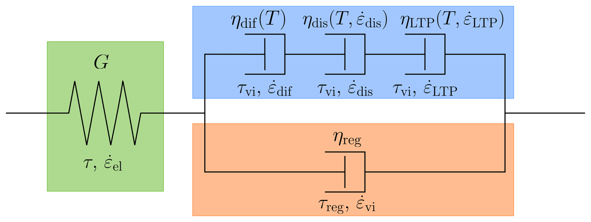 where σb, σL and σK are material constants (Hansen et al., 2019). Diffusion creep dominates deformation at low stress/high temperature and dislocation creep at medium stress/temperature. LTP is dominant at large stress/low temperature, and it behaves similarly to perfect plasticity due to brittle deformation. It remains inactive below a critical stress, but accommodates all deformation that would otherwise increase stress beyond this threshold.