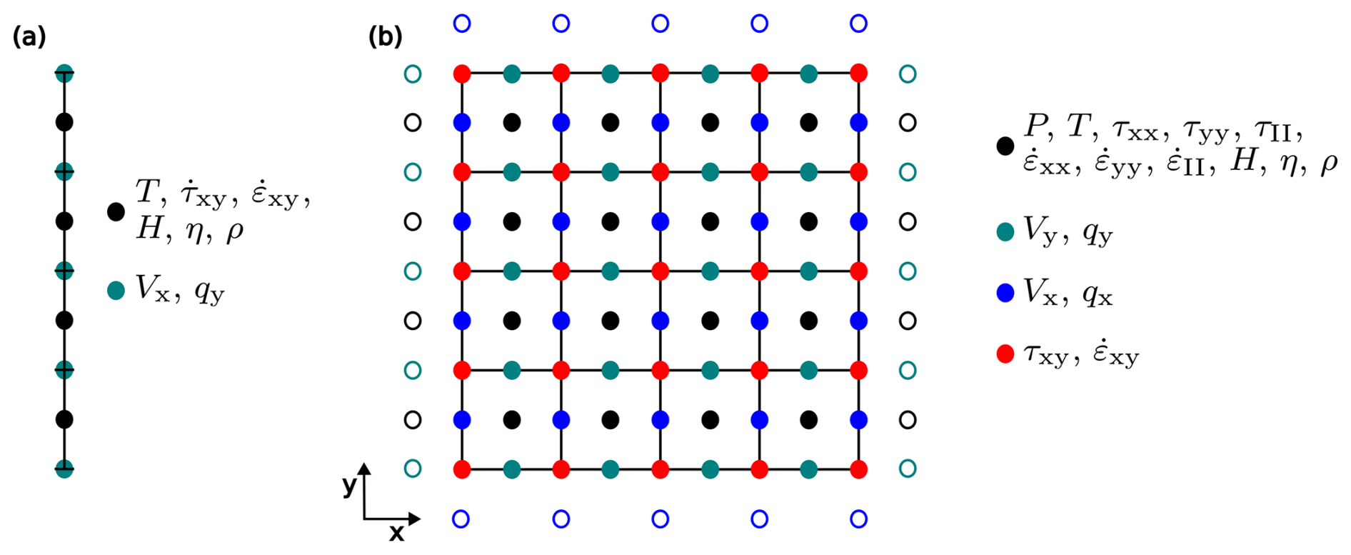 The governing equations are discretized on a staggered grid (e.g., Gerya and Yuen, 2003) using the small strain approximation. They are solved with a conservative finite-difference scheme in an iterative manner using the APT method (Frankel, 1950; Räss et al., 2022; Alkhimenkov and Podladchikov, 2024). The code is implemented in the Julia programming language and employs the GeoParams.jl package (Kaus et al., 2023) for parameter nondimensionalization. The 2D implementation further leverages the ParallelStencil.jl package (Omlin and Räss, 2024; Omlin et al., 2025) to automatically generate parallel kernels on both central processing unit (CPU) and graphics processing unit (GPU) devices.