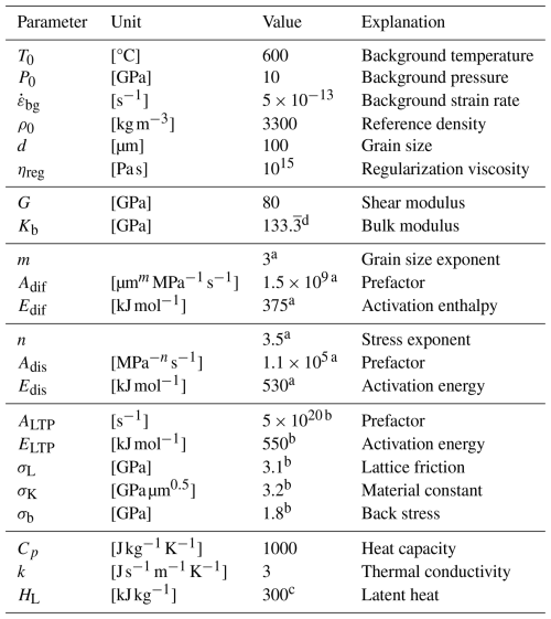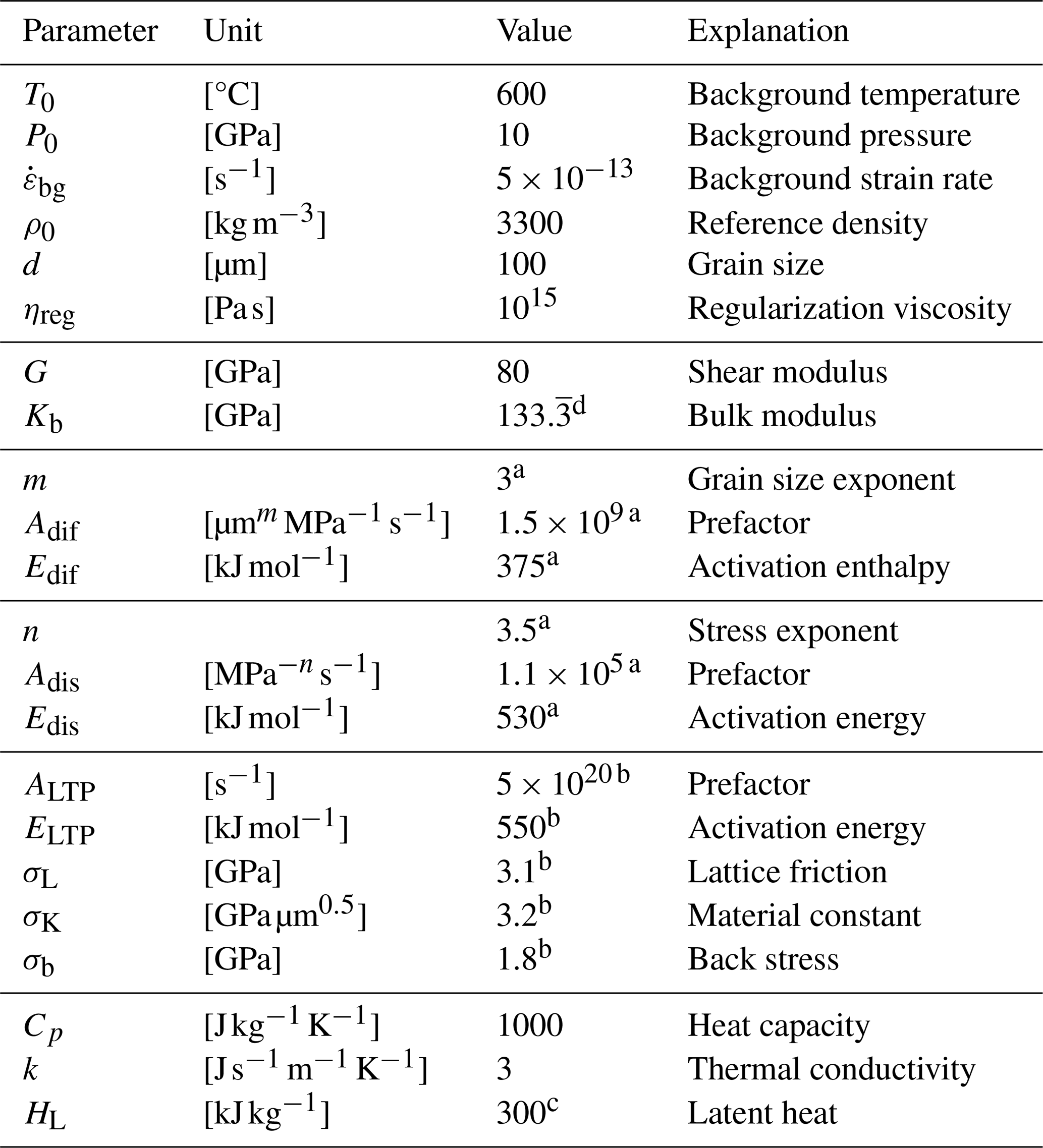 a Hirth and Kohlstedt (2003), b Hansen et al. (2019), c Schmeling et al. (2019).d Computed from G and ν=0.25.