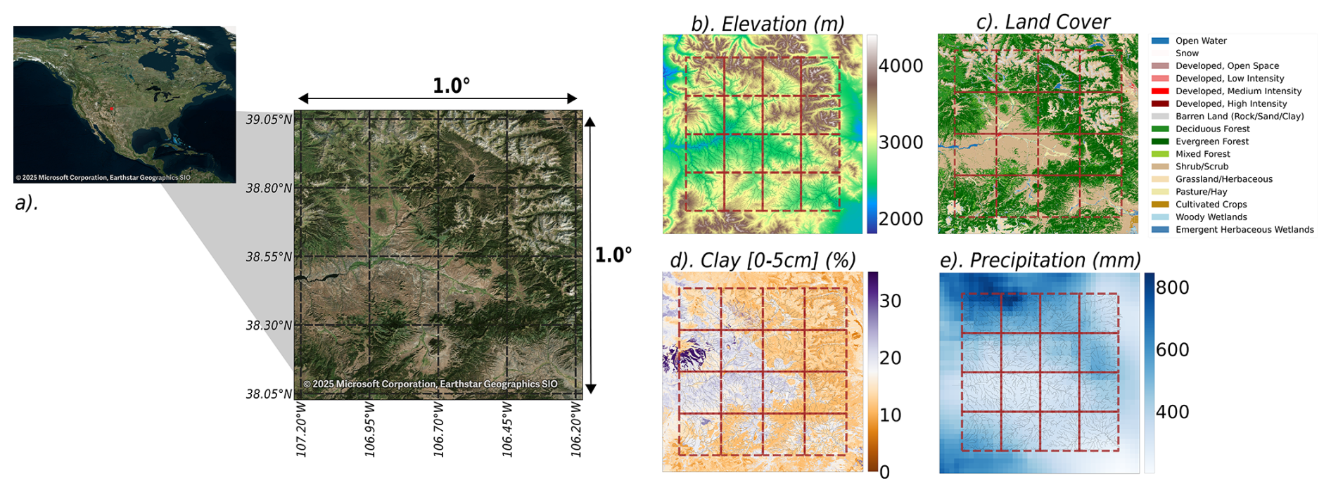 Figure 1Study domain in Colorado, USA, in a 1°×1° box. (a) Satellite image of the study area divided by a 0.25° width grid showing the headwaters of the Gunnison River catchment (from Bing Maps, Microsoft. Retrieved 1 March 2025). (b) Elevation from the National Elevation Dataset (NED) and stream network. (c) Land cover classification from the National Land Cover Database (NLCD) with predominant barren areas. (d) Soil clay content (from 30 m resolution POLARIS dataset) shows higher percentages in the riparian zones and west-draining catchments. (e) Mean annual precipitation obtained from Princeton Climate Forcing (PCF) shows higher rates towards the north-west.