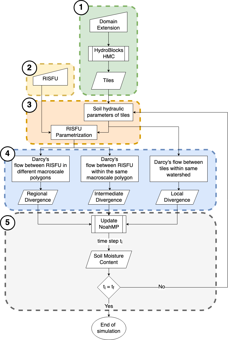 Figure 3Proposed Multiscale Methodology flow chart. Step 1 consists of HydroBlocks' HMC to generate tiles per macroscale polygon. Step 2 is the generation of the RISFUs from the cluster of watersheds obtained through the HMC algorithm. Step 3 is the parametrization of the soil hydraulic properties of the RISFUs using the tiles inside them. Step 4 consists of computing the subsurface flow between the RISFUs within the same macroscale polygon (intermediate flow) and between RISFUs along the borders of different macroscale polygons (regional flow); local flow is the flow between tiles within the same cluster of watersheds, as is already implemented in HydroBlocks. Step 5 updates the divergence term in Richards' equation, resolved with Noah-MP, to include the three scales of subsurface flow for the next time step ti until the end of the simulation tf is reached.
