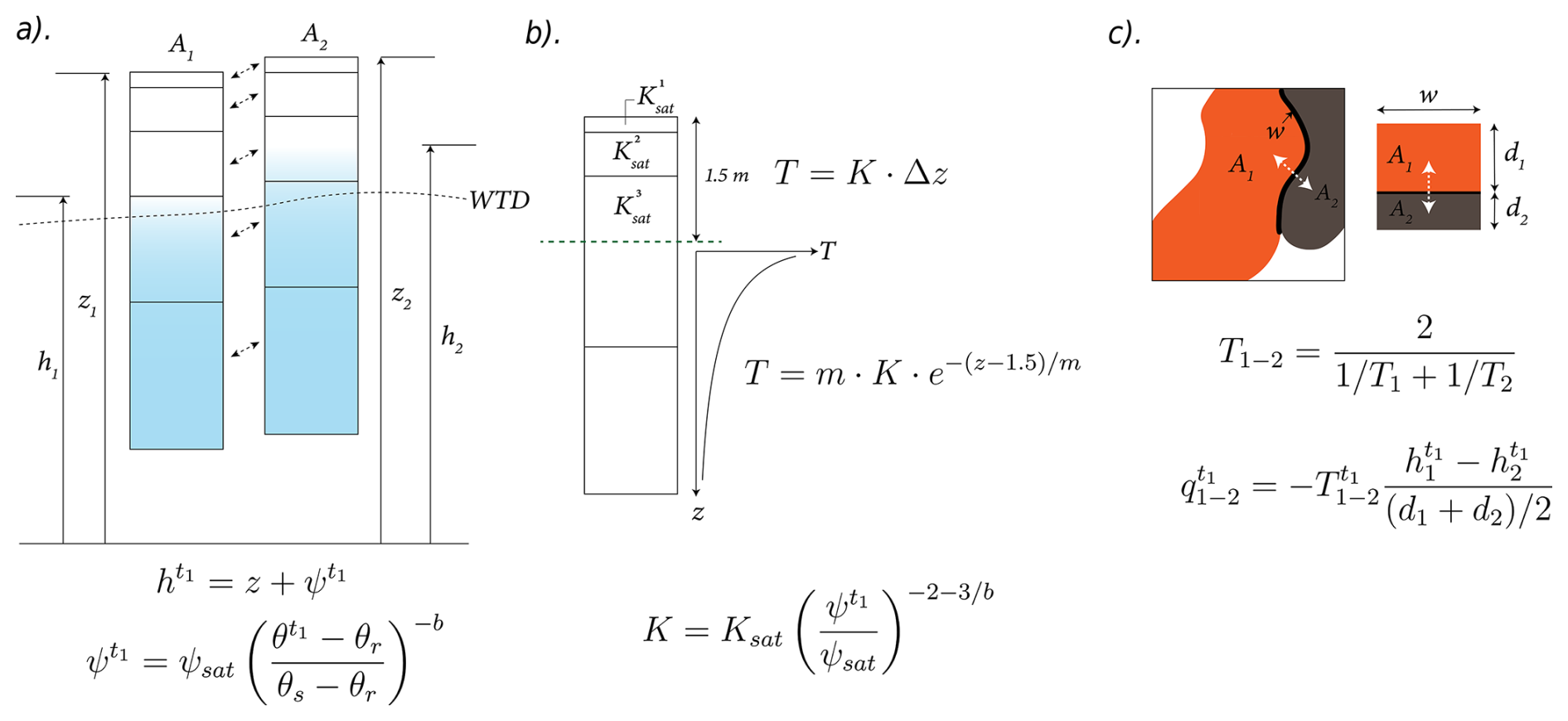 Figure 6Lateral flow between two tiles in HydroBlocks. (a) Noah-MP computes the vertical redistribution of soil moisture for each soil column. Hydraulic head (h) is estimated as the sum of the elevation of the layer (z) and the matric potential (ψ) for soil moisture conditions for time step (t1). (b) Lateral hydraulic conductivity (K) is updated every time step to account for the saturation conditions of the layers. Additionally, a decaying function to adjust K based on parameter (m) is applied to depths greater than 1.5 m. (c) Lateral flow between tiles 1 and 2 (q) is estimated based on the average transmissivity (T) and corresponding hydraulic head between the two layers of the soil columns and the distance between centroids (d1+d2)/2.