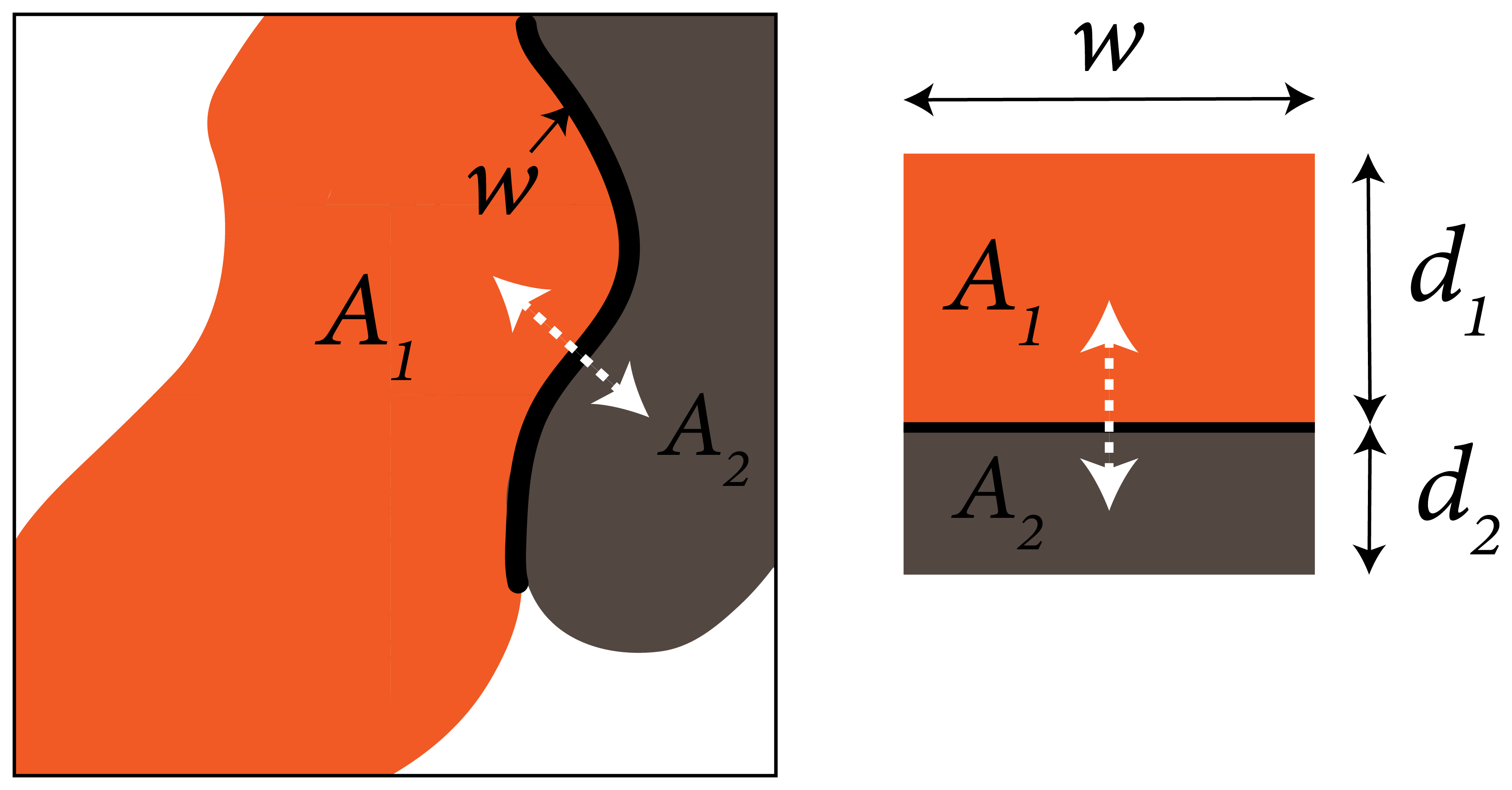 Figure 7Area approximation for irregular tiles and RISFUs. Both tiles and RISFU are approximated to a rectangle of area A=dw. Where w is the shared perimeter length between two tiles or RISFUs. The horizontal traveling distance in the direction of the flow is then computed as Δx=d1/2+d2/2.