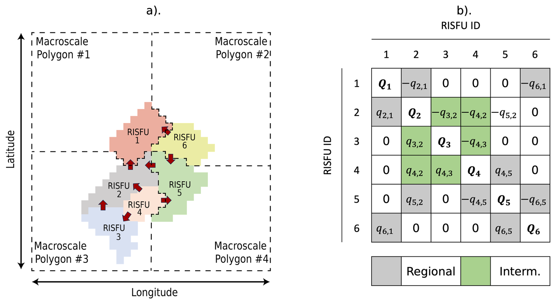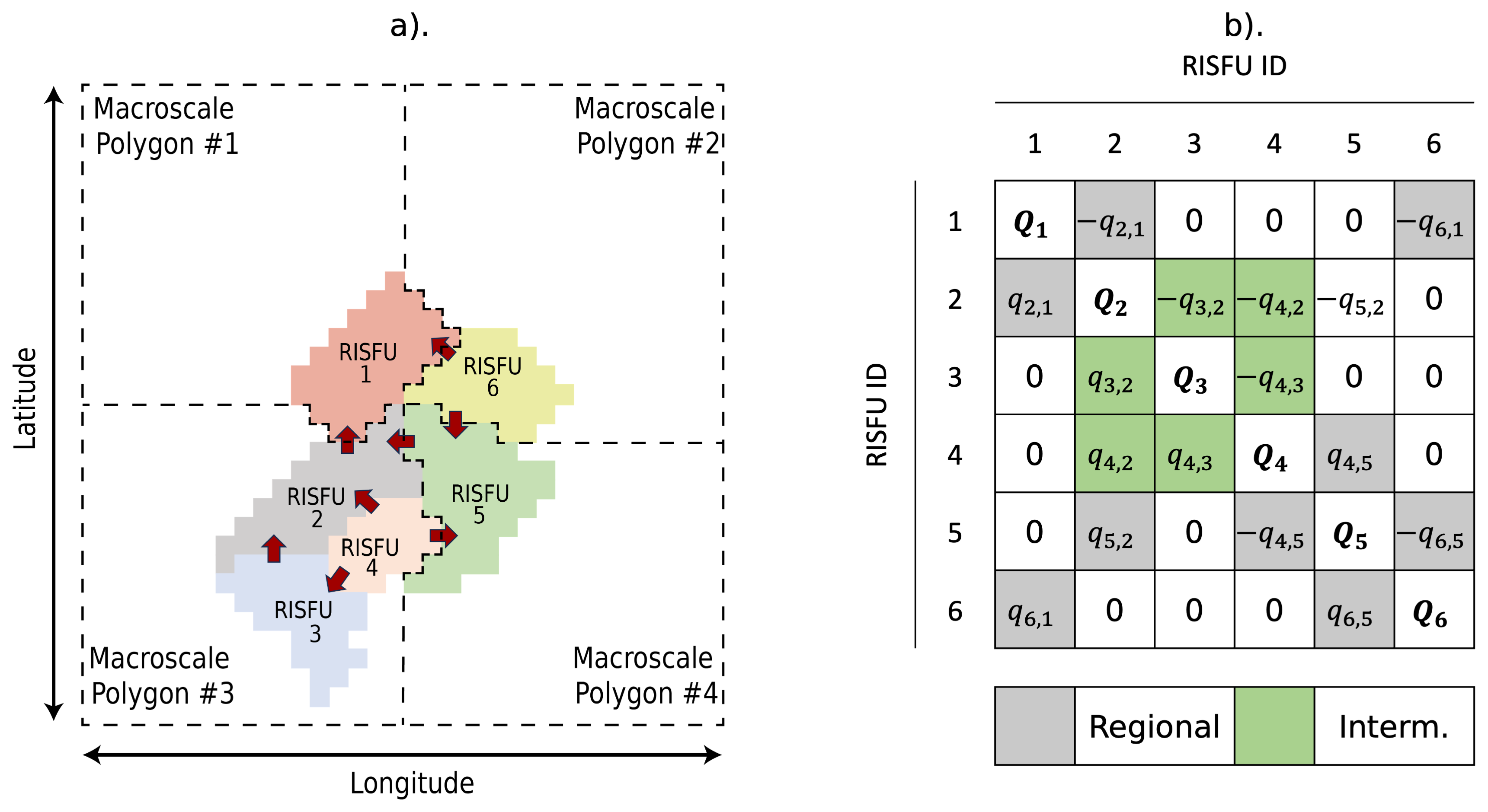 Figure 8Lateral flow scheme for intermediate and regional scales. (a) An example of six RISFUs at four different macroscale polygons to visualize the process of computing net lateral flow between RISFUs. The direction of the flow at a specific time step is indicated by the red arrows. The perimeter of each macroscale polygon is represented by the dashed line. (b) Matrix of flows between interacting units. In grey are the flows between units at different macroscale polygons to represent regional scales, and in green are the intermediate flows. Units that are not laterally connected are assigned a zero flow. The net flow for each RISFU is then computed as the arithmetic sum of all the flows q in the same row.
