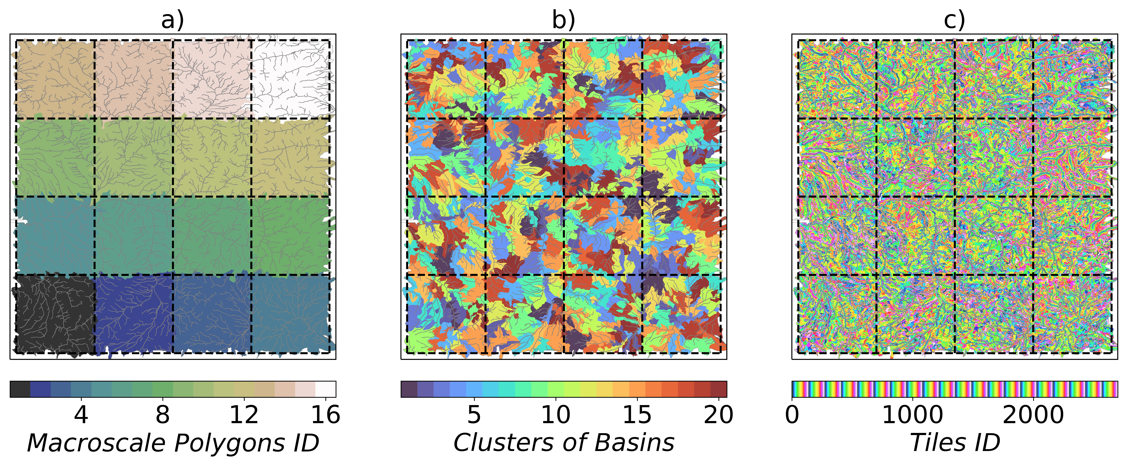 Once each macroscale polygon has its own set of tiles, the next step involves discretizing the macroscale polygon on RISFUs (Fig. 4). For this experiment, these intermediate and regional units are chosen to be the same clusters of watersheds obtained from the intermediate step in the HMC algorithm. Consequently, each macroscale polygon is subdivided into a finite number of RISFUs representing the intermediate and regional-scale subsurface system's structure. The RISFUs do not need to be the same clusters of watersheds, and the extension, shape, and number can be modified to meet specific criteria, making this approach flexible for its implementation in large-scale simulations. For our case study, the number of clusters of watersheds generated and, consequently, the number of RISFUs is determined by the parameter k, chosen equal to 20. It is worth mentioning that the selection of parameter k and the proxies of large-scale heterogeneity will prescribe how the subsurface hydrological structure is represented in the LSM. In our study, the value of k was chosen empirically to capture the spatial heterogeneity of watershed-scale features while maintaining computational efficiency over a domain with significant elevation variability. In HydroBlocks, the clustering uses K-means applied to proxies for large-scale physical heterogeneity, including latitude, longitude, elevation, and flow accumulation area. Consequently, the parameter k accounts for the interaction of multiple spatial drivers rather than focusing solely on elevation variability alone.