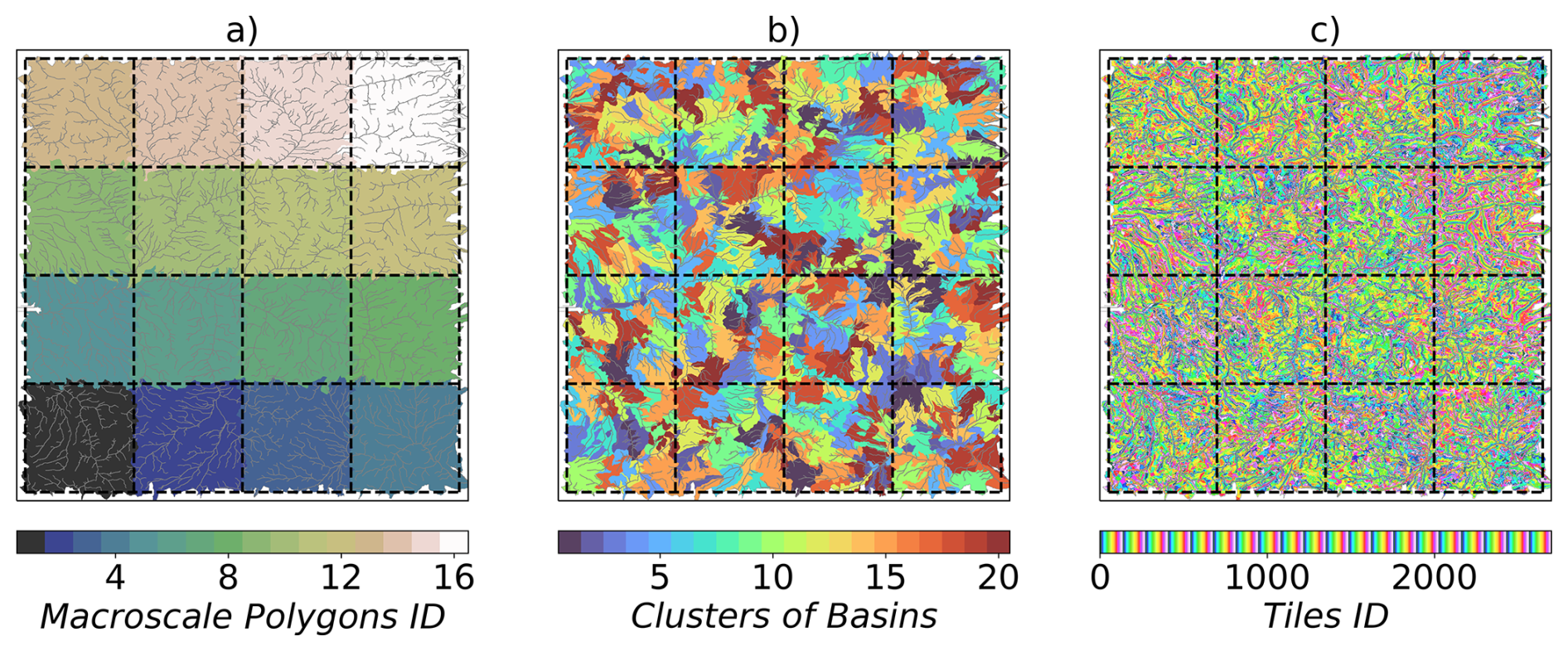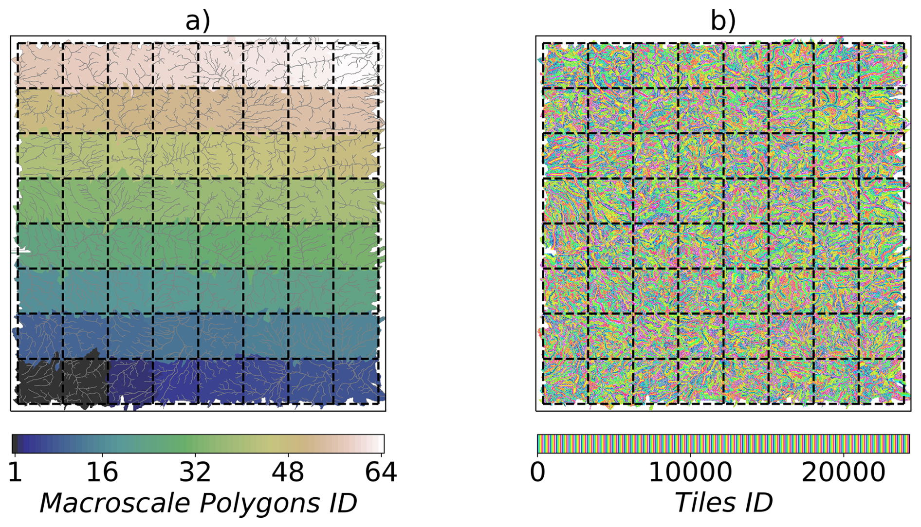 As mentioned in Sect. 2.2, HydroBlocks' HMC initially divides the modeling domain into macroscale polygons to allow for efficient parallelization in High-Performance Computing systems. Each polygon represents a self-contained group of basins within a predefined bounding box. Subsequently, the HydroBlocks HMC algorithm generates a set of independent tiles, as described in Sect. 2.2 (see Fig. 2). These tiles serve as simulation units in the Noah-MP model, enabling the solution of water and energy fluxes.