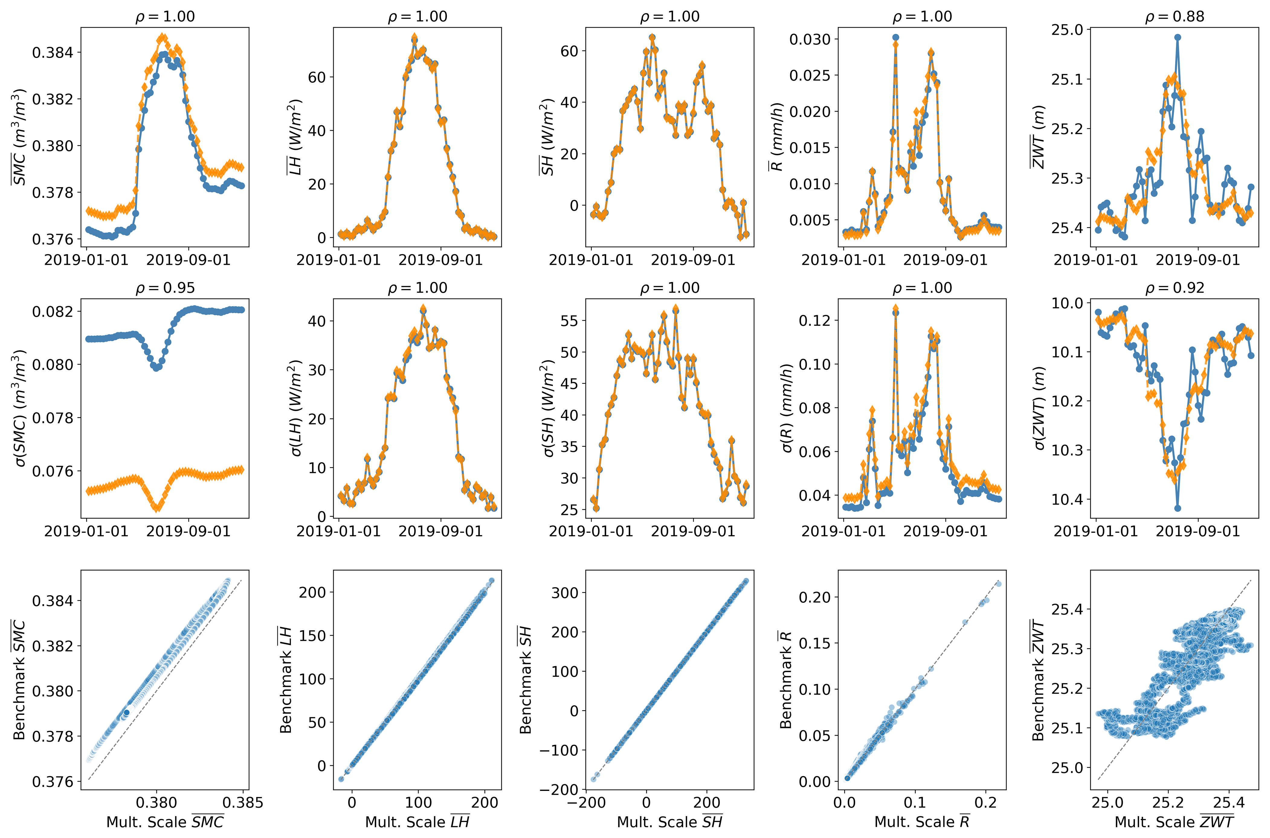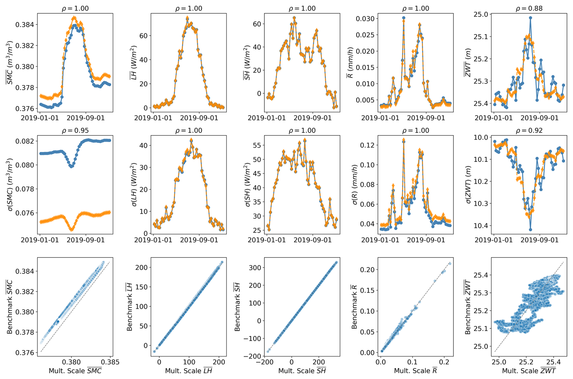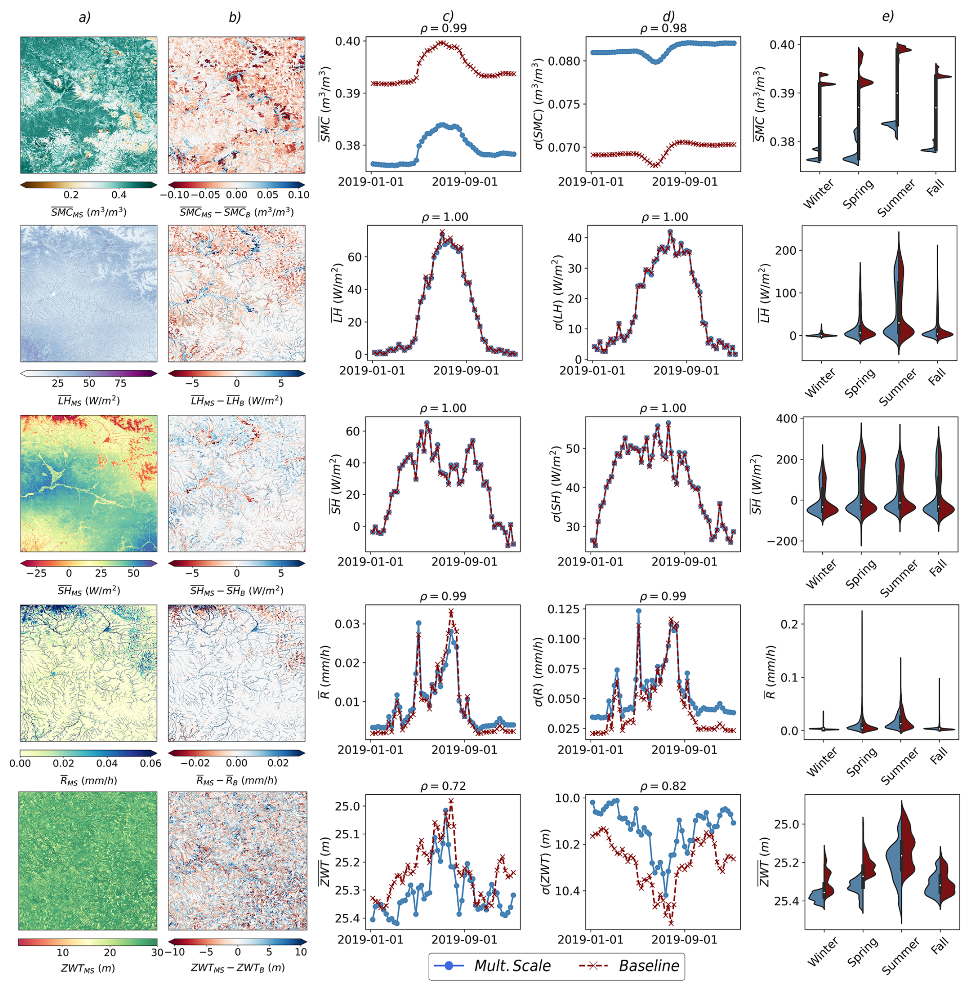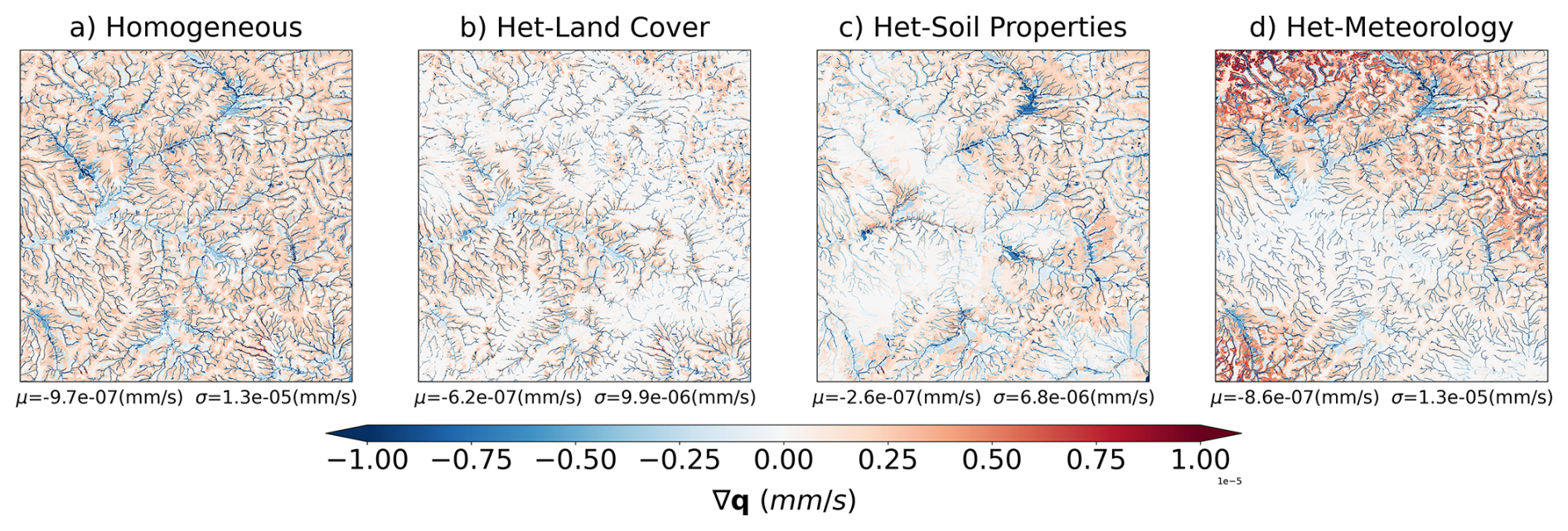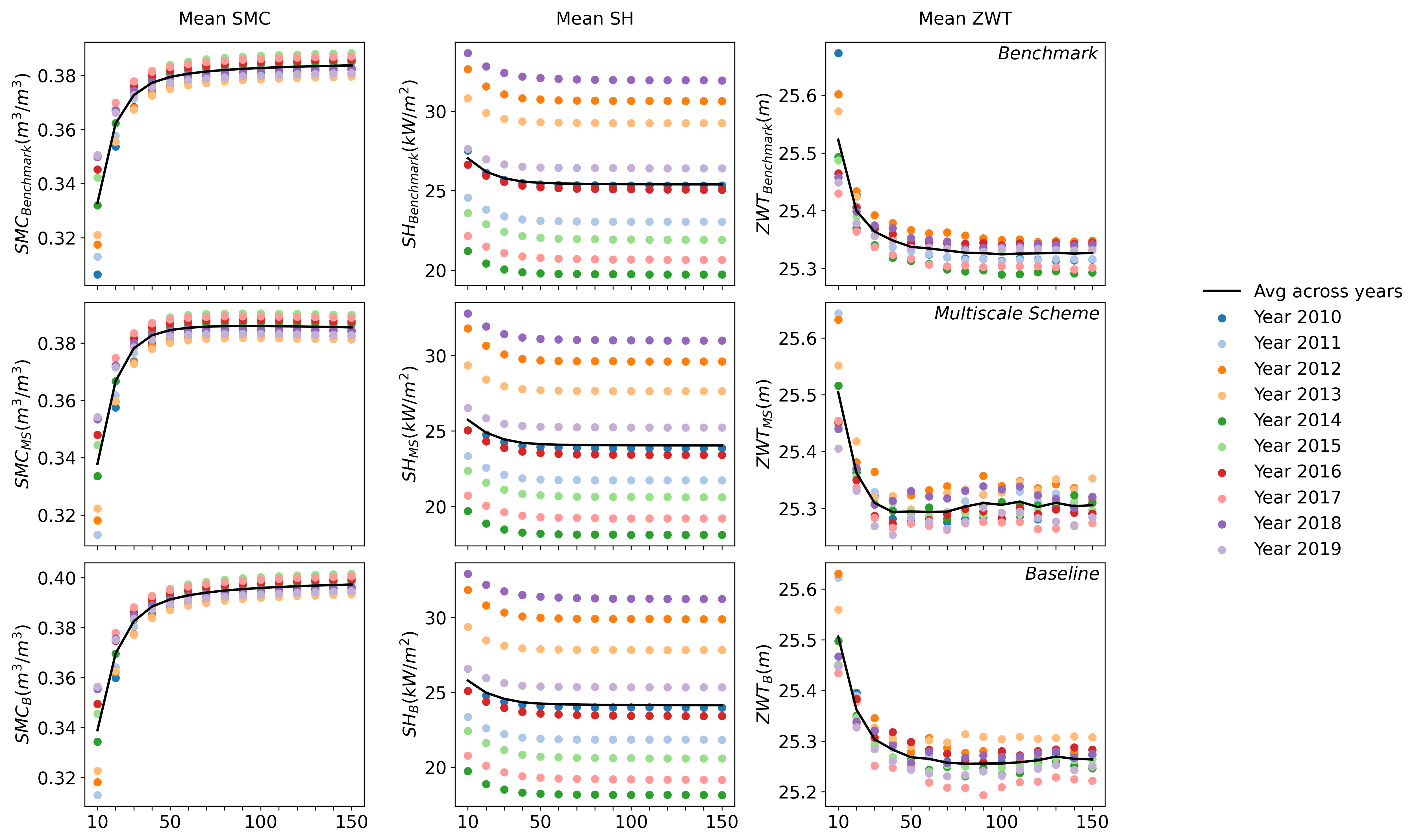The modeling community has widely recognized the challenges of incorporating high-resolution to represent small-scale subsurface processes within large-scale simulations (Choi, 2013; Fisher and Koven, 2020; Zhang and Montgomery, 1994; Zhao and Li, 2015). In alignment with the findings of Barlage et al. (2021), finer spatial resolution enables better representation of topographic convergence zones and shallow water table dynamics. Their study demonstrates that resolving these features at convection-permitting scales leads to increased root-zone soil moisture, enhanced evapotranspiration, and improved feedbacks to the atmosphere, including reductions in temperature and precipitation biases. Several modern LSMs can numerically simulate subsurface flow dynamics with high spatial resolution. These models can explicitly represent variations in topography, soil properties, and vegetation cover, leading to more accurate simulations of water movement within a basin (Kollet and Maxwell, 2008; Maxwell et al., 2015). However, these high-resolution simulations are often computationally expensive and impractical for large-scale applications like ESMs. The complexity of solving three-dimensional flow equations across large extents with high spatial resolution pushes computational resources to their limits.