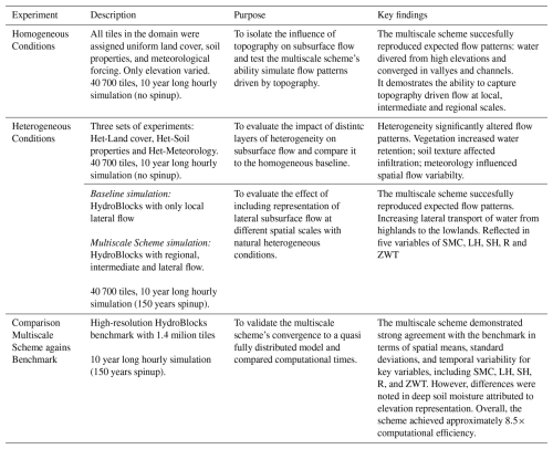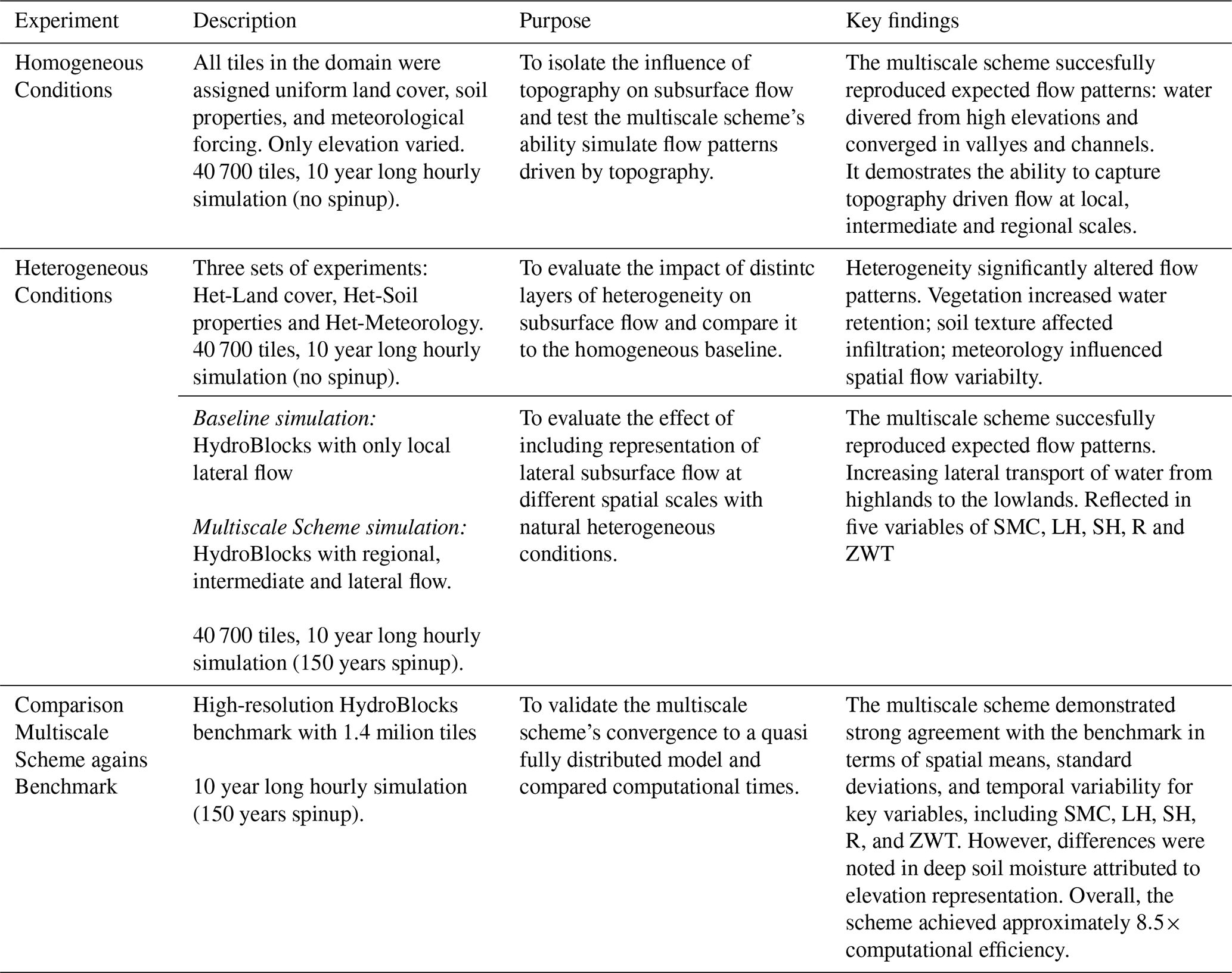 One promising strategy for accounting for small-scale processes in large-scale simulations involves implementing tiling schemes. These schemes essentially group together hydrologically similar areas based on common characteristics such as soil type, land cover, topography, etc., that will respond similarly under equivalent meteorological forcing within an LSM grid cell, reducing the overall number of modeling units and leading to improved computational efficiency (Chaney et al., 2016, 2018, 2021; Flügel, 1995; Manrique-Suñén et al., 2013; Melton et al., 2017; Pilotto et al., 2017). This allows the incorporation of small-scale heterogeneity within large-scale simulations without sacrificing computational feasibility. Tiling schemes can bridge the gap between computationally expensive high-resolution models and practical large-scale simulations (Blyth et al., 2021; Clark et al., 2015; Fisher and Koven, 2020). Furthermore, a potential advantage of tiling schemes is that they simulate lateral subsurface movement by allowing water exchange between neighboring tiles. This exchange can be based on factors like the hydraulic gradient or other relevant parameters specific to the hydrological setting. Moreover, tiling schemes offer scalability: the number and complexity of tiles within a grid cell can be adjusted based on the model's needs and available computational resources. This allows for efficient simulations at both coarse and fine scales.