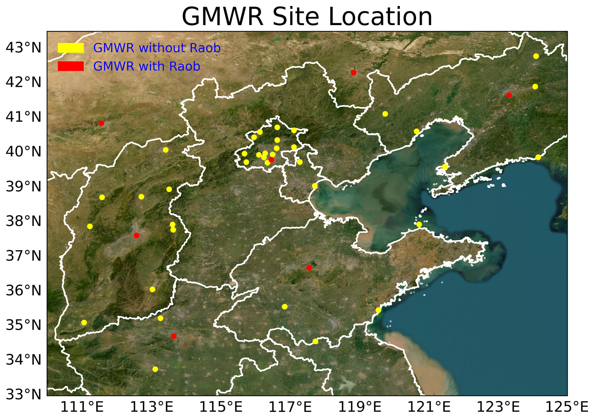 Figure 1Spatial distribution of ground-based microwave radiometers (GMWRs) in North China. Yellow markers denote stations equipped only with GMWRs, while red markers indicate stations where GMWRs are co-located with radiosonde launches. The topographical basemap is retrieved from ArcGIS Online powered by Esri (Esri et al., 2025).