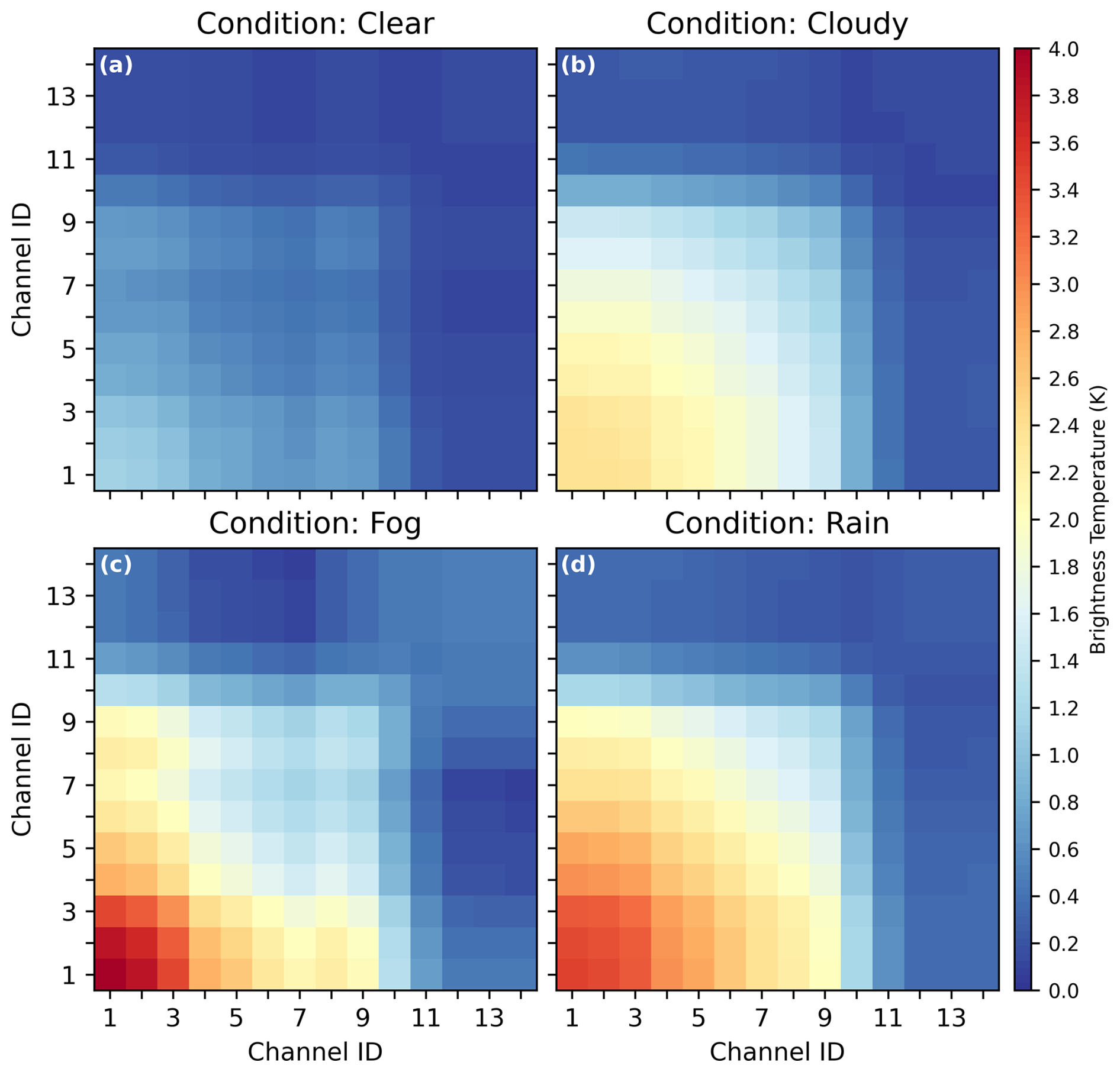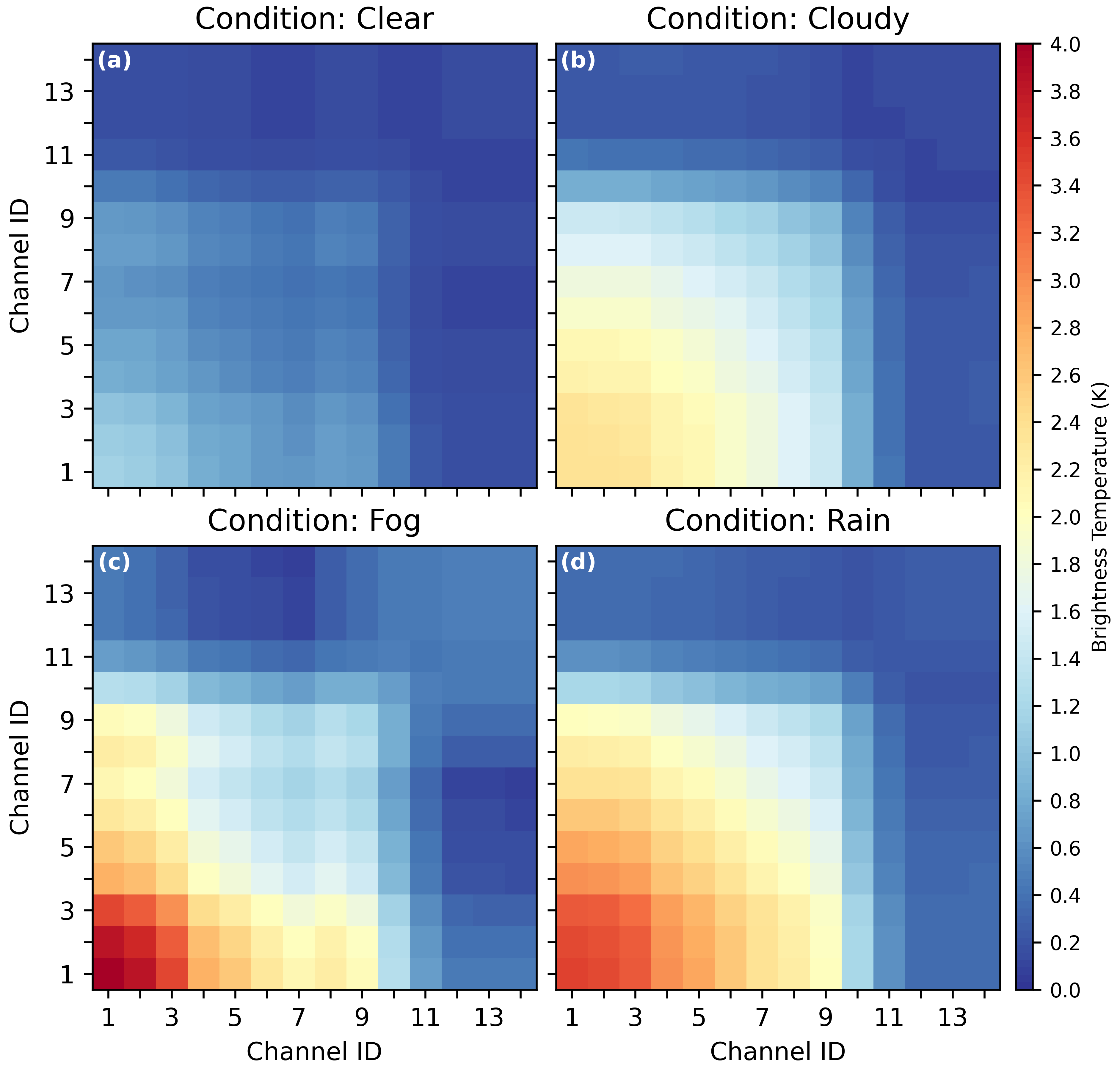 Figure 2Square root of the error covariance matrices of brightness temperature differences between ground-based microwave radiometer (GMWR) observations and radiosonde-based simulations for different weather conditions: (a) clear-sky conditions, (b) cloudy conditions, (c) fog conditions, and (d) precipitation conditions.
