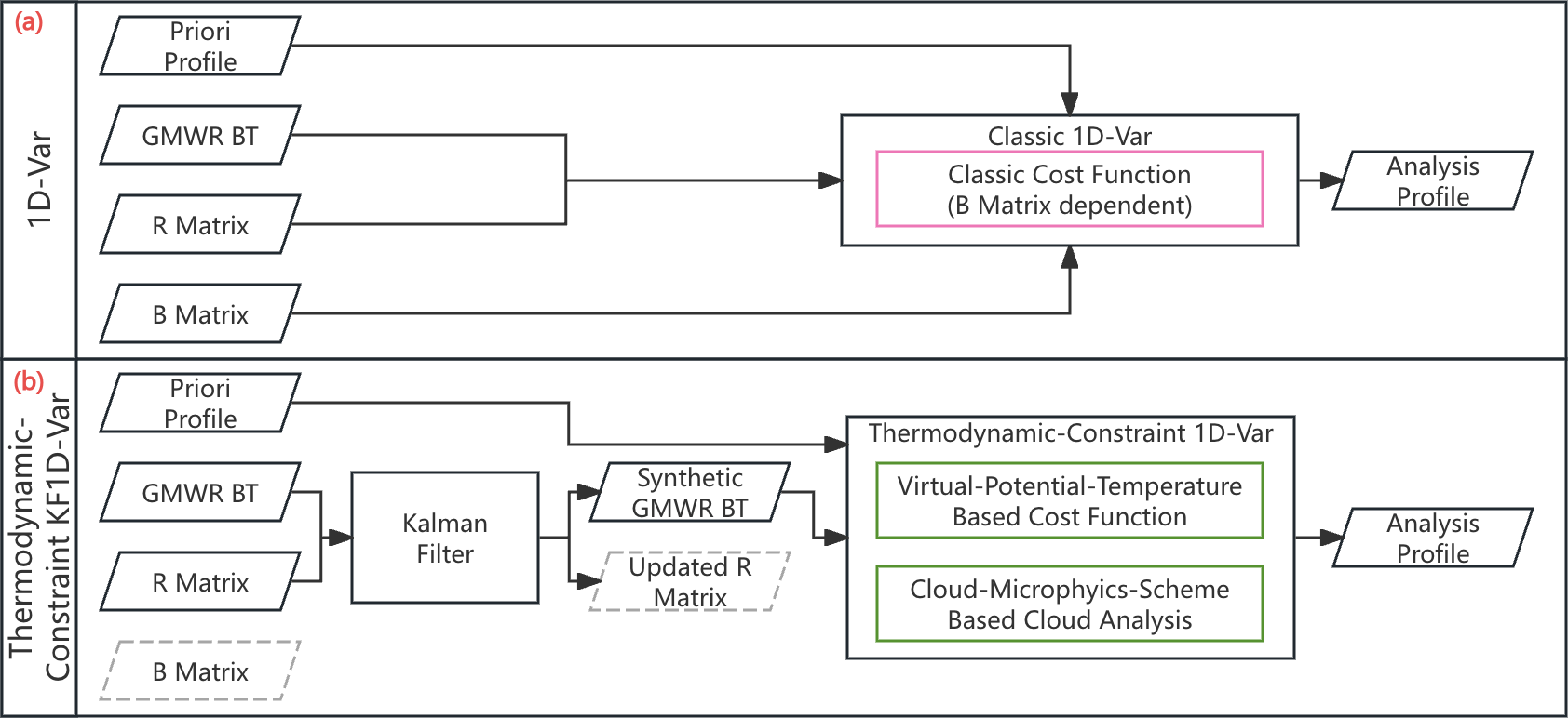 As a widely used approach to retrieve atmospheric state, 1D-Var (Fig. 3a) has been used in thermodynamic profile retrieval systems for both ground-based (Hewison and Gaffard, 2006; Martinet et al., 2017; Gamage et al., 2020), airbone (Thelen et al., 2009; Bell et al., 2021a), and spacebone instruments (Noh et al., 2021; Wang et al., 2024; Carminati, 2022) by minimizing the cost function (Rodgers, 2000) Eq. (1):