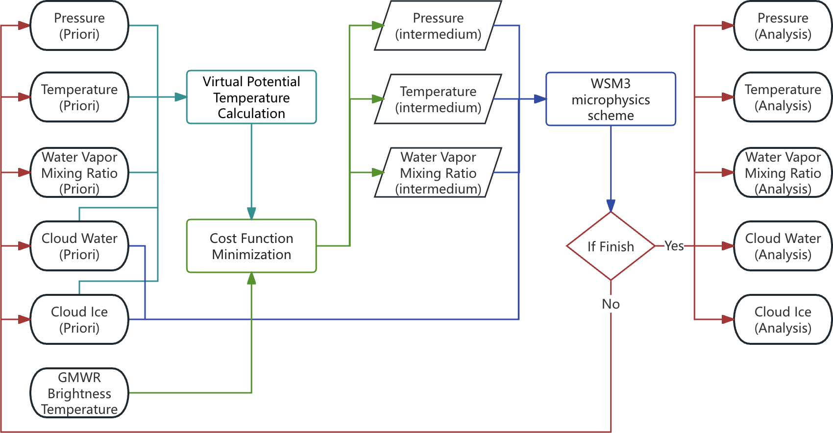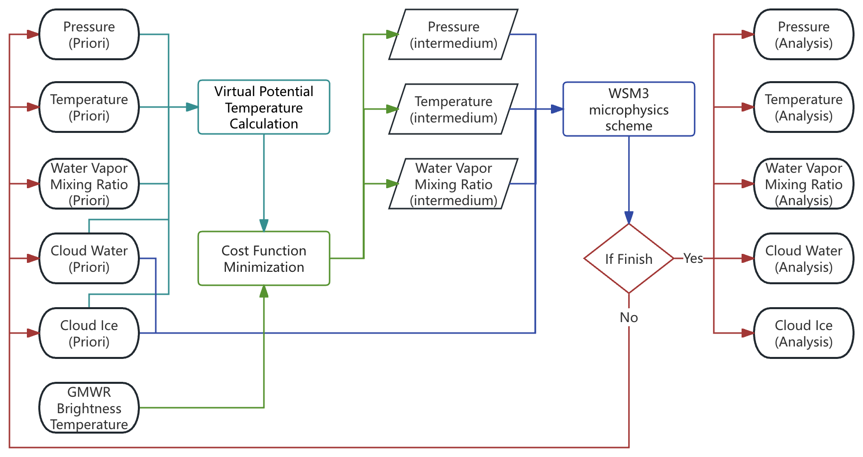 While RTTOV-gb incorporates the influence of cloud liquid water in brightness temperature calculations and provides the corresponding Jacobians, the inherently discontinuous vertical structure of clouds in the real atmosphere prevents liquid water profiles from being retrieved in a manner consistent with temperature and humidity profiles. Moreover, RTTOV-gb accounts only for liquid water, neglecting the impact of cloud ice. As a result, constructing the observational term of the cost function solely with RTTOV-gb is insufficient to ensure its physical consistency and closure. Therefore, the inclusion of a cloud microphysics scheme in the cost function is essential to achieve a physically consistent and closed formulation. Considering the trade-off between computational efficiency and simulation accuracy, the WSM3 single-moment microphysics scheme (Hong et al., 2004; Que et al., 2016) is employed as the basis for the diagnostic representation of cloud liquid water and cloud ice profiles. The coupling between the thermodynamic constraint and the WSM3 single-moment microphysics scheme is illustrated in Fig. 4. The procedure begins with the calculation of the virtual potential temperature from the priori thermodynamic and hydrometeor profile. These fields serve as the initial state for the cost function minimization, where the cost function iteratively adjusts the pressure, temperature, and water vapor mixing ratio using the GMWR brightness temperature observations to produce intermedium profiles. The WSM3 microphysics scheme then dynamically updates the cloud water and cloud ice mixing ratios based on the intermediate pressure, temperature, and water vapor profiles, together with the priori hydrometeor fields. This coupling ensures physical consistency between the thermodynamic state and the microphysical processes during each iteration. If the convergence criterion is satisfied, the resulting profiles of temperature, humidity, and hydrometeors are designated as the final analysis. Otherwise, the updated fields are fed back into the next iteration as new initial conditions until convergence is achieved.