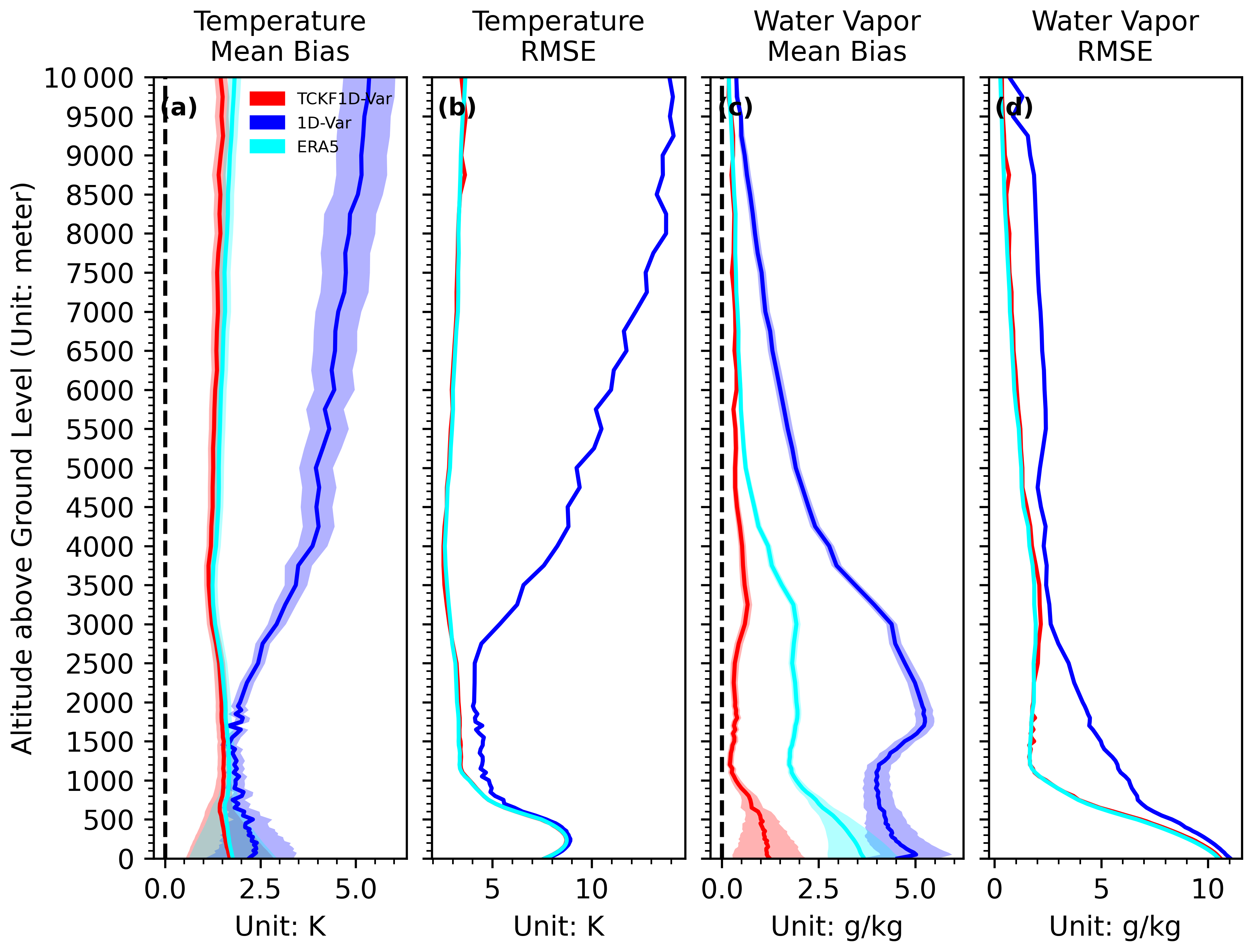Figure 5Validation of temperature and water vapor profiles retrieved by TCKF1D-Var (red), ERA5 a priori (cyan), and 1D-Var (blue) against radiosonde observations. The shaded areas denote the 95 % confidence intervals that have passed the significance test. For temperature, TCKF1D-Var reduces the mean bias (a) relative to the a priori and yields smaller overall random errors (b) than 1D-Var. For water vapor, TCKF1D-Var substantially decreases the mean bias (c) compared to the a priori, particularly below 5500 m, while its random errors (d) are smaller than 1D-Var near the surface but remain larger than the a priori aloft.