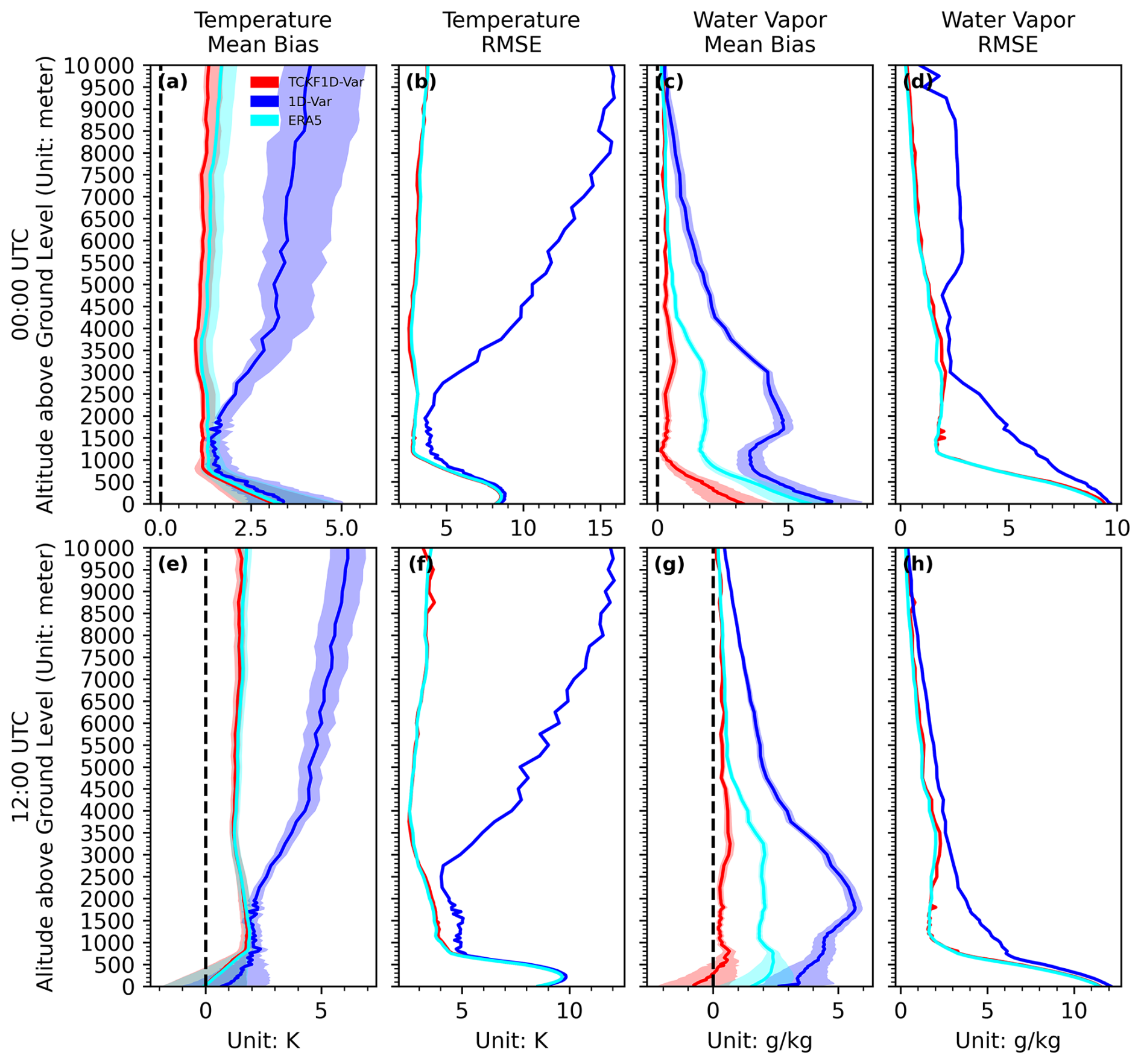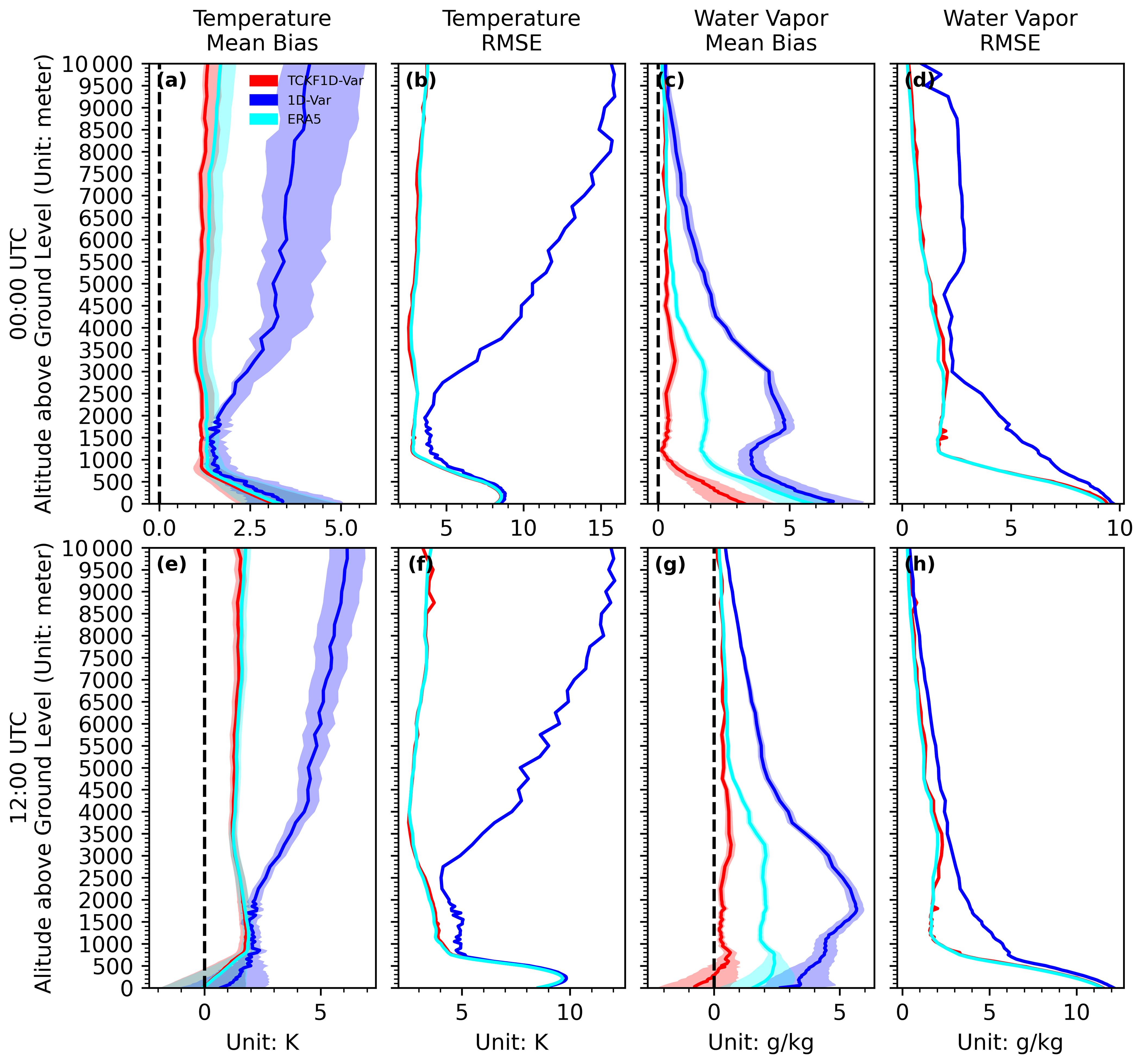Figure 6Validation of temperature and water vapor profiles retrieved by TCKF1D-Var (red), ERA5 a priori (cyan), and 1D-Var (blue) against radiosonde observations at 00:00 UTC (a–d) and 12:00 UTC (e–h). The shaded areas denote the 95 % confidence intervals that have passed the significance test. Panels (a), (e) show mean temperature bias, indicating that TCKF1D-Var provides the most effective correction of systematic errors relative to the a priori. Panels (b), (f) present temperature RMSE, where TCKF1D-Var maintains smaller random errors than 1D-Var during daytime, but shows increased errors above 2000 m at night. Panels (c), (g) show mean water vapor bias, with TCKF1D-Var substantially reducing systematic errors compared to the other methods, while differences between 1D-Var are most evident above 5500 m. Panels (d), (h) depict water vapor RMSE, again showing improved performance of TCKF1D-Var near the surface, with daytime differences between 1D-Var diminishing at night.