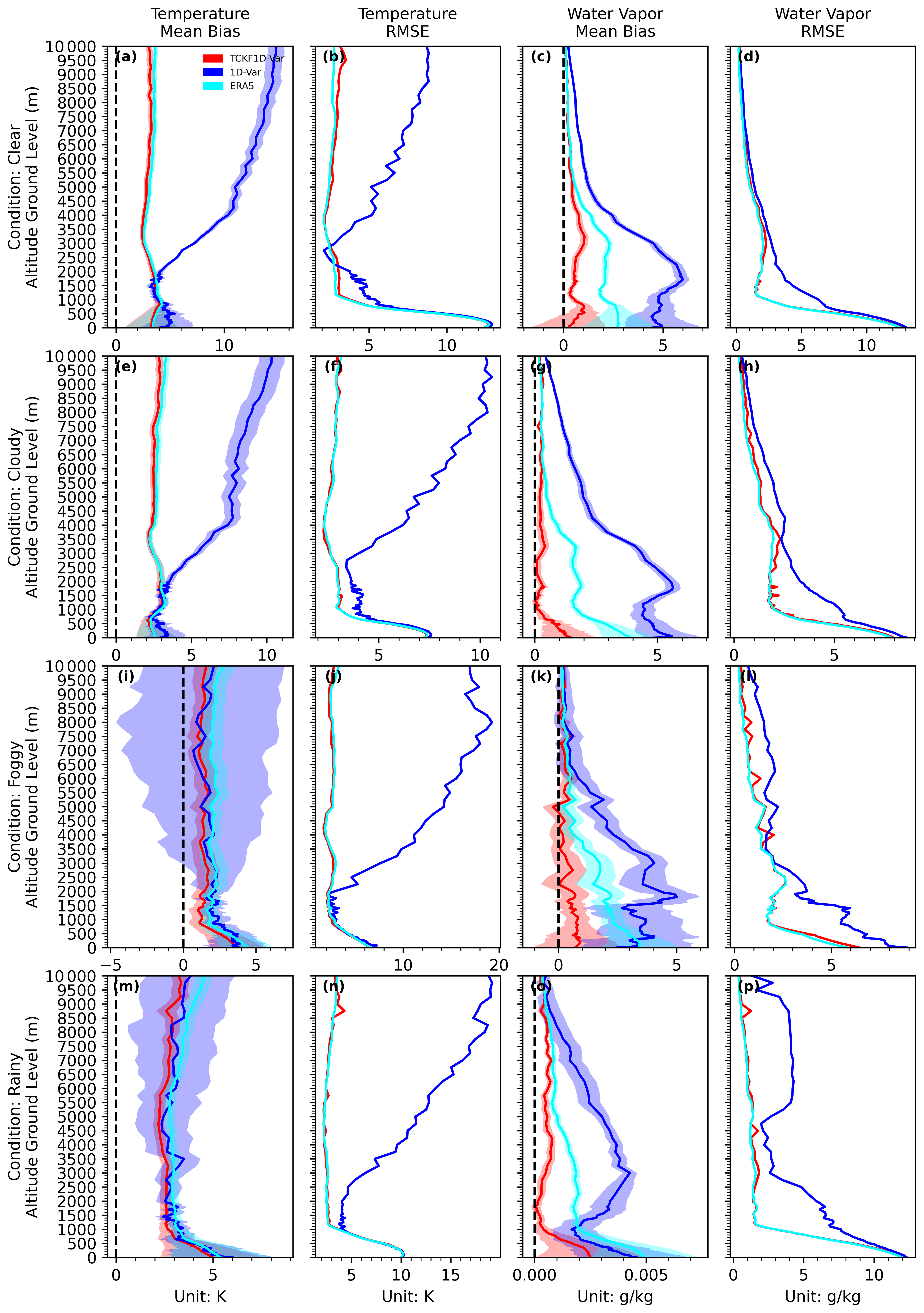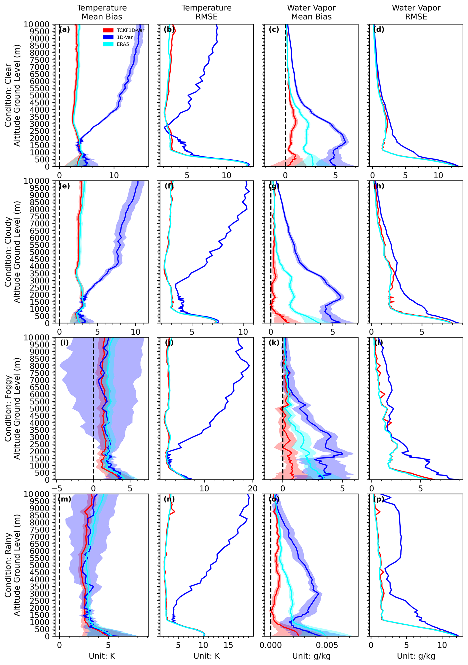 Figure 7Mean errors (a, e, i, n) and root-mean-square errors (b, f, j, o for temperature; c, g, k, p for water vapor) of retrieved profiles under four weather conditions: clear-sky, cloudy, foggy, and rainy. The shaded areas denote the 95 % confidence intervals that have passed the significance test. TCKF1D-Var consistently shows smaller temperature biases than ERA5 and 1D-Var below 5 km, with performance comparable to ERA5 above this level. ERA5 exhibits higher errors than 1D-Var above 3 km. For water vapor, TCKF1D-Var outperforms both ERA5 and 1D-Var across all regimes, while ERA5 displays larger boundary-layer errors (below ∼ 500 m in foggy cases and below ∼ 1000 m in rainy cases). In all conditions, the RMSEs of TCKF1D-Var are comparable to ERA5 and lower than 1D-Var.