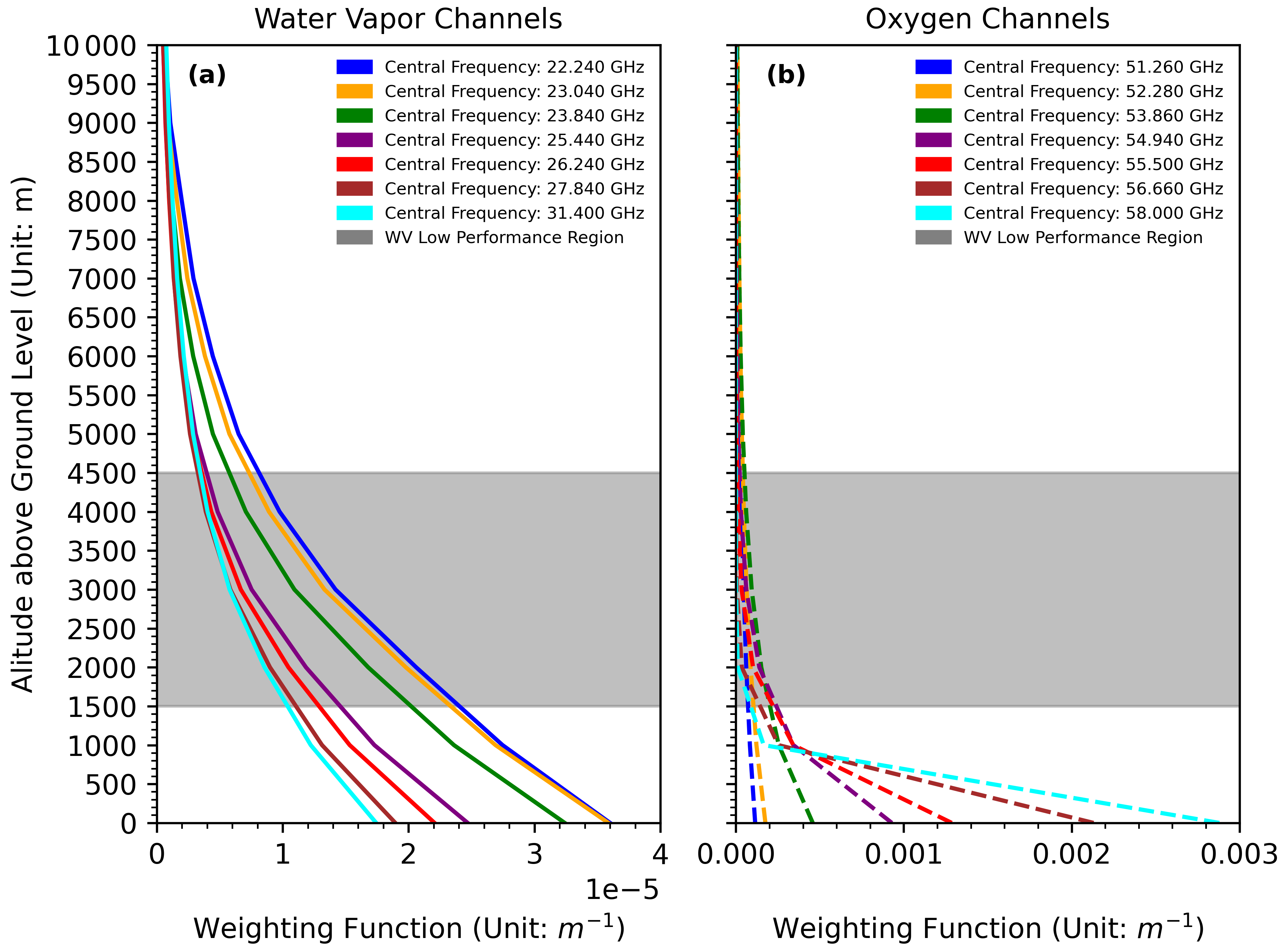 Despite the overall accuracy improvements achieved by the TCKF1D-Var framework, the retrieved water vapor profiles still exhibit systematic degradation in the middle troposphere (approximately 1.5–4.5 km) from the aspect of RMSE. A primary cause of this problem is the inherent coupling between temperature and humidity signals in the GMWR-measured brightness temperatures. While oxygen channels provide constraints on the temperature structure, their weighting functions peak at vertical levels, calculated by PyRTlib (Python package for non-scattering line-by-line microwave radiative transfer simulations, Larosa et al., 2024) using US Standard Atmosphere profile as background (U.S. Committee on Extension to the Standard Atmosphere, 1976), do not coincide with those of the water vapor channels (Fig. 8). This vertical resolution mismatch leads to a partial leakage of temperature uncertainties into the humidity retrieval, thereby amplifying errors in this altitude range. The effect is particularly pronounced where temperature-sensitive channels show weak sensitivity, while humidity-sensitive channels remain reasonably responsive, leaving the retrieval under-constrained and more dependent on the completeness of the cost function design. Such temperature–humidity coupling has been reported in earlier radiative transfer and retrieval studies (e.g., Hewison, 2007; Löhnert and Maier, 2012), underscoring the necessity of explicitly characterizing vertical resolution mismatches and accounting for cross-variable error propagation when developing retrieval strategies. By contrast, a similar RMSE degradation is not observed in the temperature profiles. This asymmetry arises because the oxygen channels provide stronger and more vertically distinct weighting functions, which dominate the temperature information content and are only weakly influenced by humidity-related uncertainties. Furthermore, humidity channels have comparatively limited indirect sensitivity to temperature, and thus cannot introduce significant contamination into the temperature solution. As a result, the temperature retrieval remains well constrained across the troposphere, preventing the amplification of mid-level RMSE seen in the humidity retrieval.