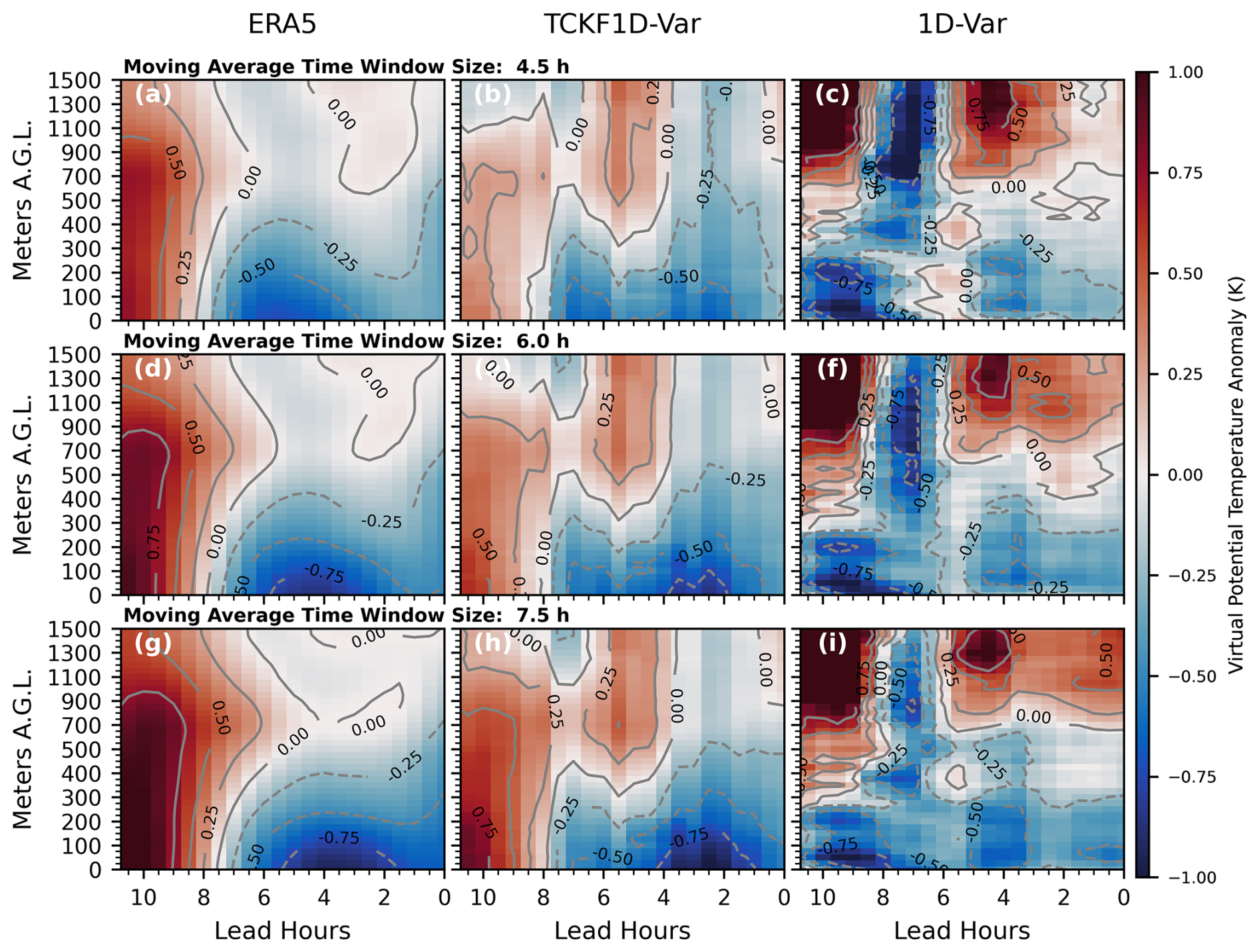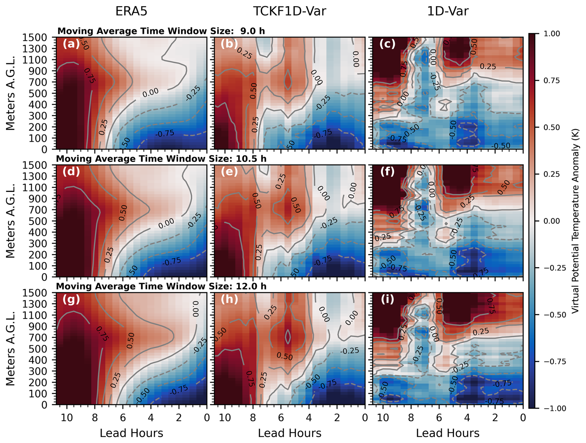 Figure 11Case-averaged time–height evolution of virtual potential temperature anomalies derived from ERA5 (a, d, g), TCKF1D-Var (b, e, h), and 1D-Var (c, f, i) under different temporal averaging windows of 9.0 h (a–c), 10.5 h (d–f), and 12.0 h (g–i), spanning from 11 h before to the onset of precipitation. ERA5 and TCKF1D-Var reveal the positive-to-negative anomaly transition below 400 m and the warm anomaly tongue intrusion between 400–1100 m, serving as precursors of heavy rainfall. Compared to ERA5, TCKF1D-Var provides stronger signals and longer lead times (7.5–8.0 h), whereas 1D-Var fails to capture these features and exhibits spurious anomaly layers under the −0.75 K criterion.