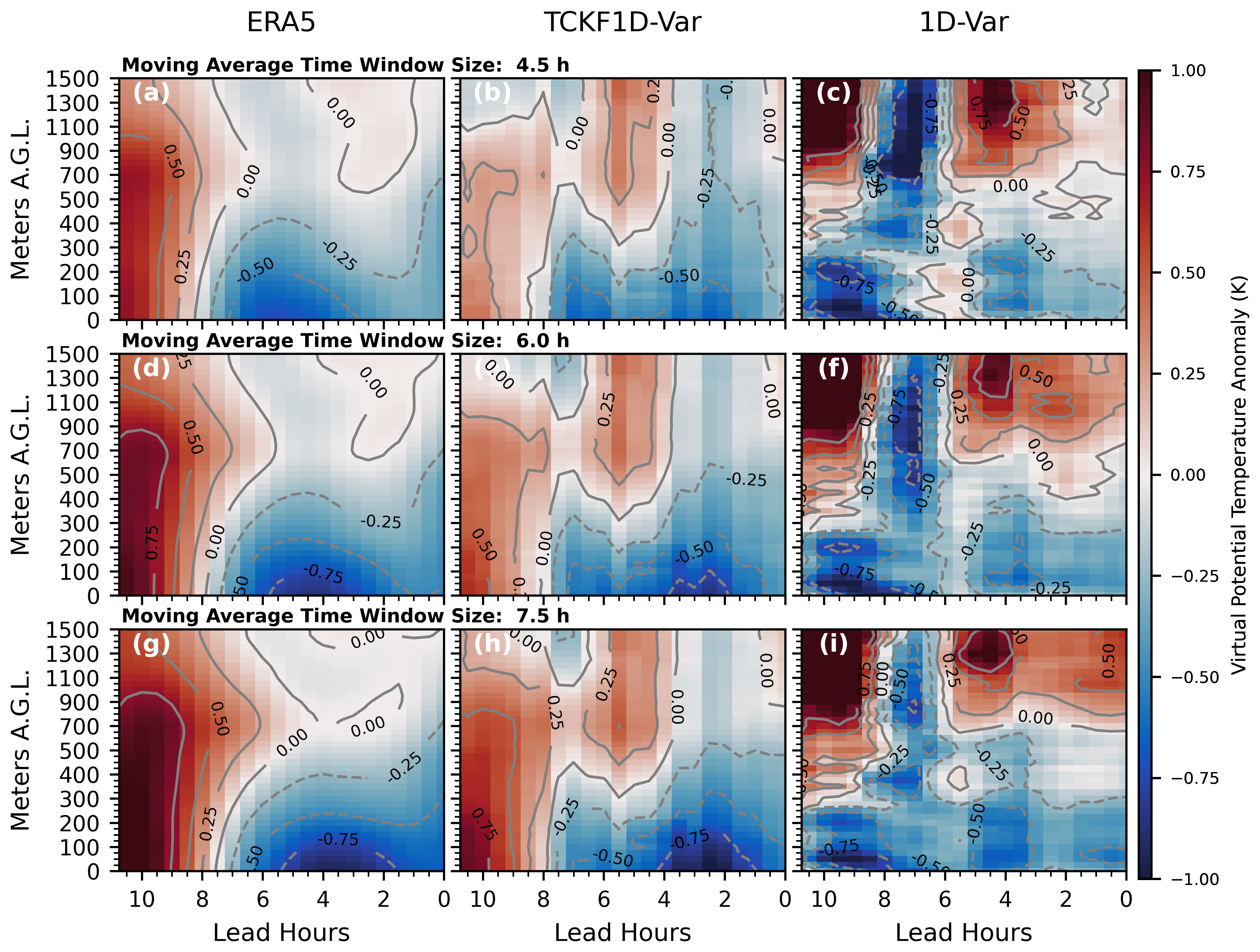Figure A1Case-averaged time–height evolution of virtual potential temperature anomalies derived from ERA5 (a, d, g), TCKF1D-Var (b, e, h), and 1D-Var (c, f, i) under reduced temporal averaging windows of 4.5 h (a–c), 6.0 h (d–f), and 7.5 h (g–i). Compared to Fig. 10, anomaly gradients weaken with shorter windows; however, ERA5 and TCKF1D-Var still capture the positive-to-negative transition ∼ 7–8 h before rainfall onset and the warm anomaly tongue intrusion, albeit with reduced intensity. The −0.75 K early-warning signal is indistinct for the 4.5 h window but becomes clearer and more temporally stable (∼ 2 h offset) for the 6.0 and 7.5 h windows, while 1D-Var fails to provide effective precursors.
