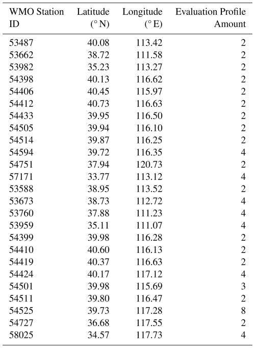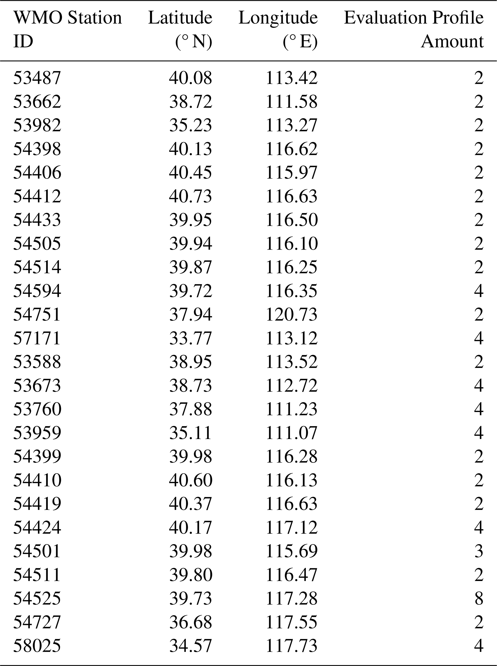 Two radiosondes are launched daily from stations 53463, 53772, 54218, 54340, 54511, 54727, and 57083 (red dots in Fig. 1), typically around 23:15 and 11:15 UTC. These routine soundings are employed as reference (“truth”) data for constructing observation error covariance matrices and for evaluating the retrieval accuracy. The radiosondes provide high-quality vertical profiles with well-documented instrumental characteristics: temperature is measured with a resolution of 0.1 K and an accuracy of 0.5 K, relative humidity with a resolution of 1 % and an accuracy of 5 %, and pressure with a resolution of 0.1 hPa and an accuracy of 0.5 hPa (Yao et al., 2025). Such specifications ensure that the radiosonde observations are sufficiently accurate to serve as an independent benchmark against which the ground-based microwave radiometer retrievals can be objectively assessed.