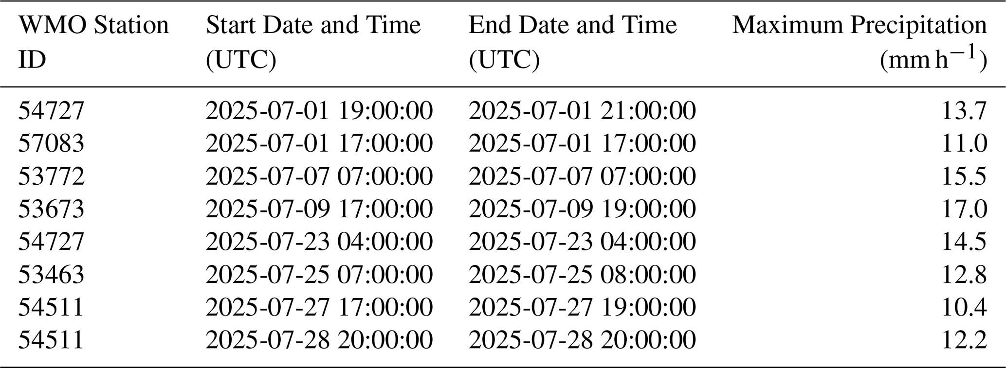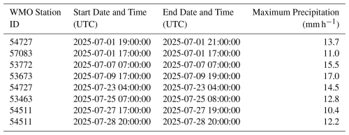 The preceding results demonstrate that the thermodynamic profiles retrieved from TCKF1D-Var framework exhibit smaller mean biases than ERA5, with root-mean-square errors lower than those from 1D-Var and comparable to ERA5, while the retrieved cloud liquid water content shows a higher degree of consistency with EarthCARE observations compared to both 1D-Var and ERA5. To further confirm that these improvements in retrieval accuracy translate into practical benefits, we investigate their implications for the early identification of extreme precipitation signals. Using the criterion of hourly accumulated precipitation exceeding 10 mm to define heavy rainfall events (World Meteorological Organization, 2007), we identified eight short-duration extereme precipitation cases in July 2025 at stations equipped with GMWRs (Table 2). Following the approach proposed by Taylor et al. (2007) and Garcia-Carreras et al. (2010), we adopt the temporal moving anomaly of virtual potential temperature as an early-warning indicator, which removes slowly varying background signals associated with large-scale processes and diurnal variations. Using the selected precipitation cases, we analyze the time series derived from different profile products and evaluate its relationship with the onset of heavy rainfall events. The temporal deviation of virtual potential temperature is calculated as follows: