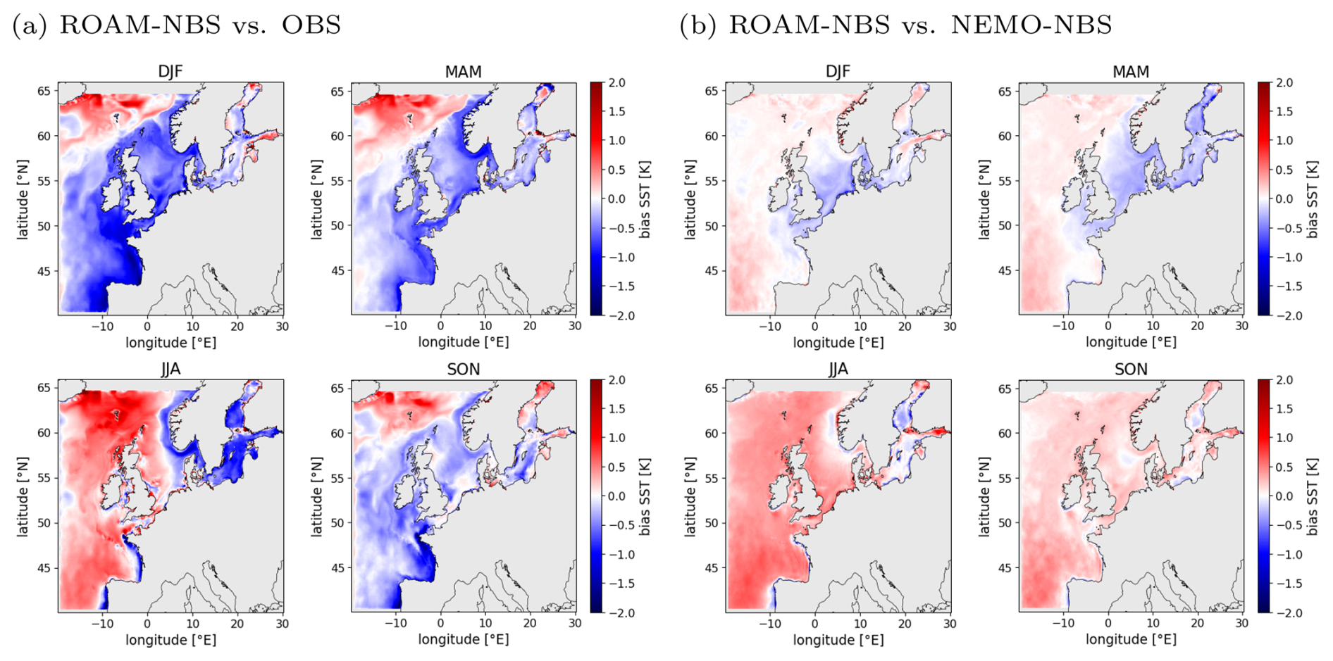 Figure 2Seasonal mean sea surface temperature difference between ROAM-NBS and Copernicus observations (a) and ROAM-NBS and NEMO-NBS (b) for the period September 1981–November 2020.
