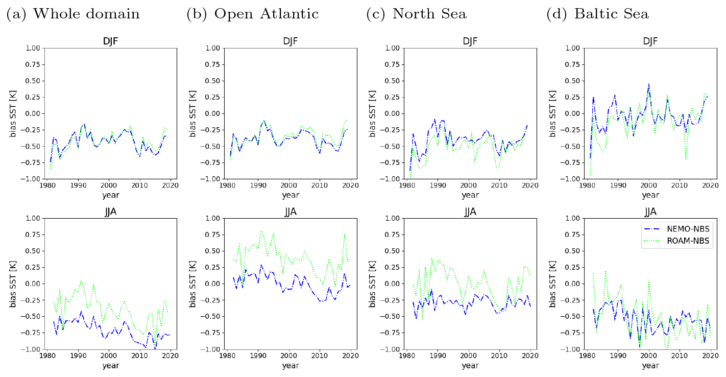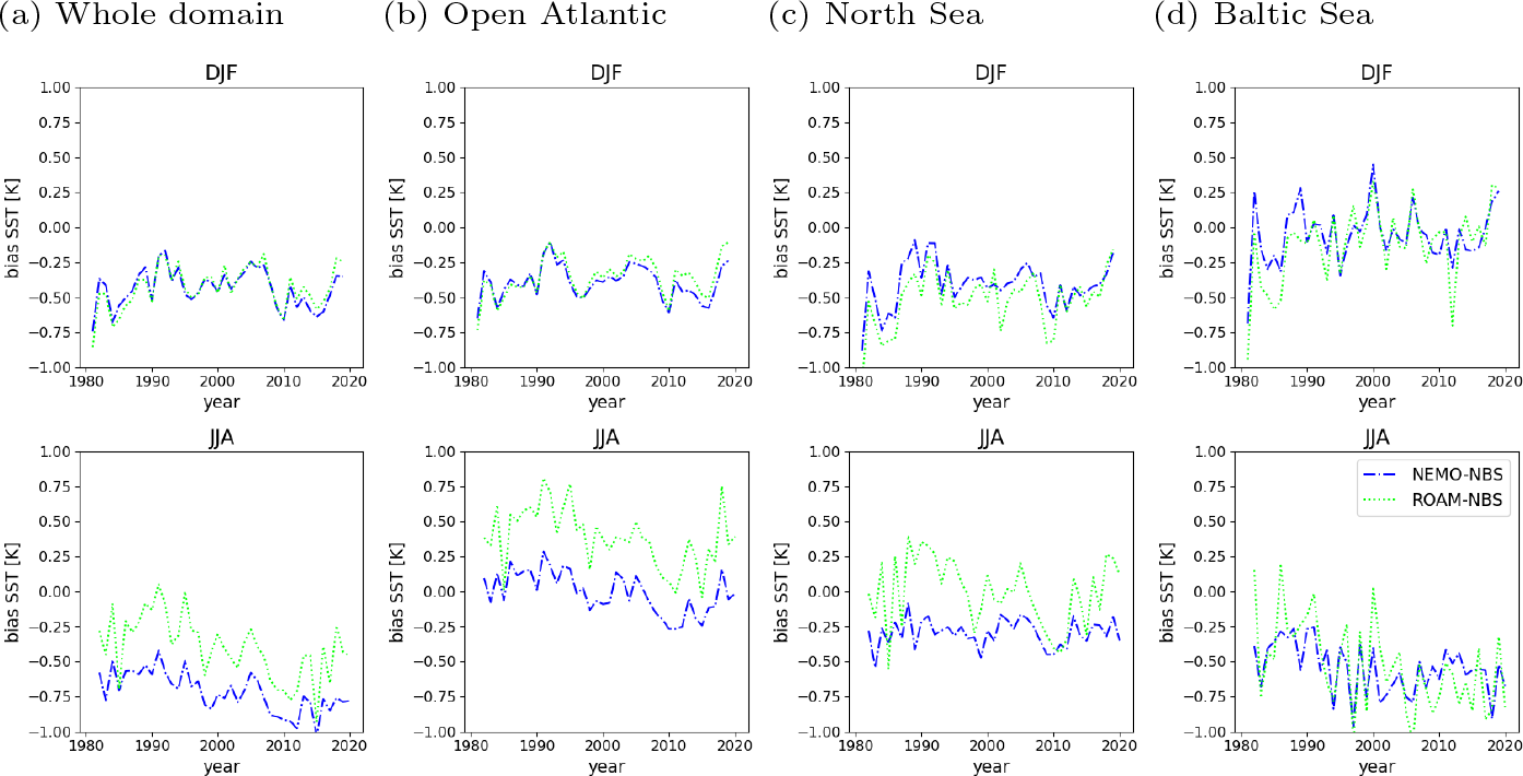 Figure 3Bias of winter (DJF) and summer (JJA) seasonal mean SST time series for NEMO-NBS and ROAM-NBS to Copernicus observation data for the whole NEMO-NBS domain (a), Open Atlantic (b), the North Sea (c) and the Baltic Sea (d).