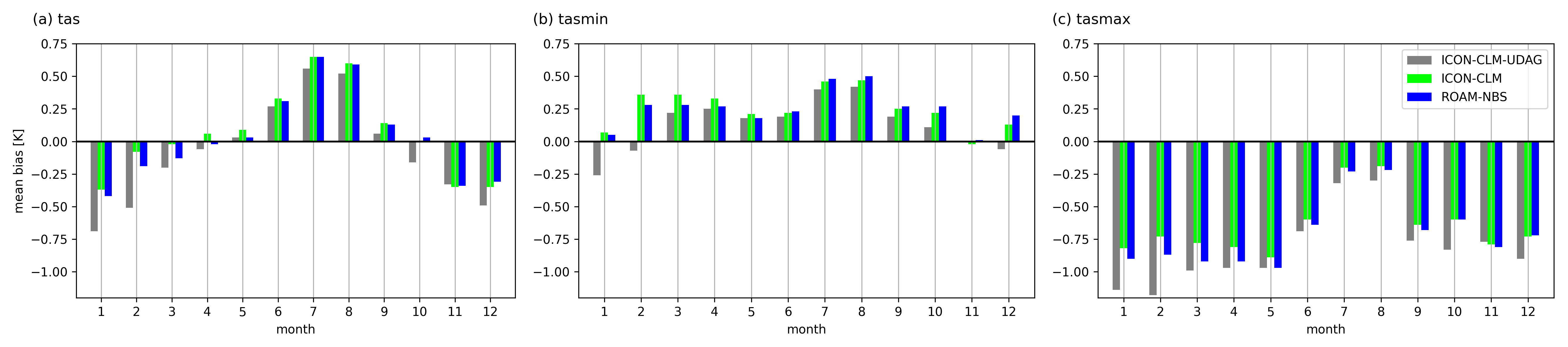 Figure 5Monthly and spatial mean biases of tas, tasmin, and tasmax against E-OBS for ICON-CLM-UDAG, ICON-CLM, and ROAM-NBS, averaged over 1979–2020.