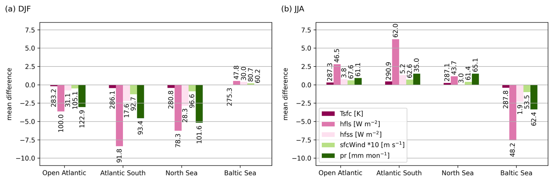 The mean values of precipitation and evaporation differences between ROAM-NBS and ICON-CLM are also provided for different ocean domains in Fig. 7, together with the differences for sensible heat flux (hfss), 10 m wind speed (sfcWind) and surface temperature (Tsfc). Tsfc over the (ice-free) ocean in ICON is equivalent to the SST. The absolute differences clearly show that the sign of the Tsfc difference determines the sign of the flux, sfcWind and pr differences. For example, for a lower Tsfc of ROAM-NBS as in the Open Atlantic, Atlantic South and North Sea boxes in DJF and the Baltic Sea box in JJA, also hfls, hfss, sfcWind, and pr are lower than in ICON-CLM. Accordingly, all differences in the Open Atlantic, Atlantic South and North Sea boxes in JJA are positive. The only exception is the Baltic Sea in DJF, where the spatially averaged Tsfc differences are very small (below −0.05 K). The absolute area-averages for ICON-CLM (given as numbers in Fig. 7) show that the fluxes, and therefore, also the flux differences become higher over a warmer ocean surface. Looking at the Atlantic South and the North Sea in DJF, for example, the Tsfc difference is very similar in both regions (−0.45 and −0.43 K, respectively), but the heat flux difference is larger for the Atlantic South (−10.57 W m−2 for the sum of hfls and hfss compared to −9.13 W m−2 for the North Sea). But the Atlantic South is, on average, warmer than the North Sea (286.1 K compared to 280.8 K). However, the absolute temperatures of the ocean surface cannot explain all differences; otherwise the fluxes would be much higher in JJA than in DJF. The temperature and humidity of the overlying air masses, as well as the mean wind speed, also have an influence. The sfcWind differences are shown as their interpretation is more straightforward than that of the momentum flux, which is given as u and v components. The sign of the sfcWind differences being in agreement with the flux differences shows that more mixing due to higher surface temperatures does not only result in stronger turbulent heat fluxes but also in more downward mixing of horizontal momentum and, thus, in higher near-surface wind speeds (and vice versa). In conclusion, SST biases, which are already present in NEMO-NBS and introduced into the coupled simulation, are directly reflected by the turbulent heat fluxes, near-surface wind speed and precipitation. However, these biases have no systematic impact on the land areas.
