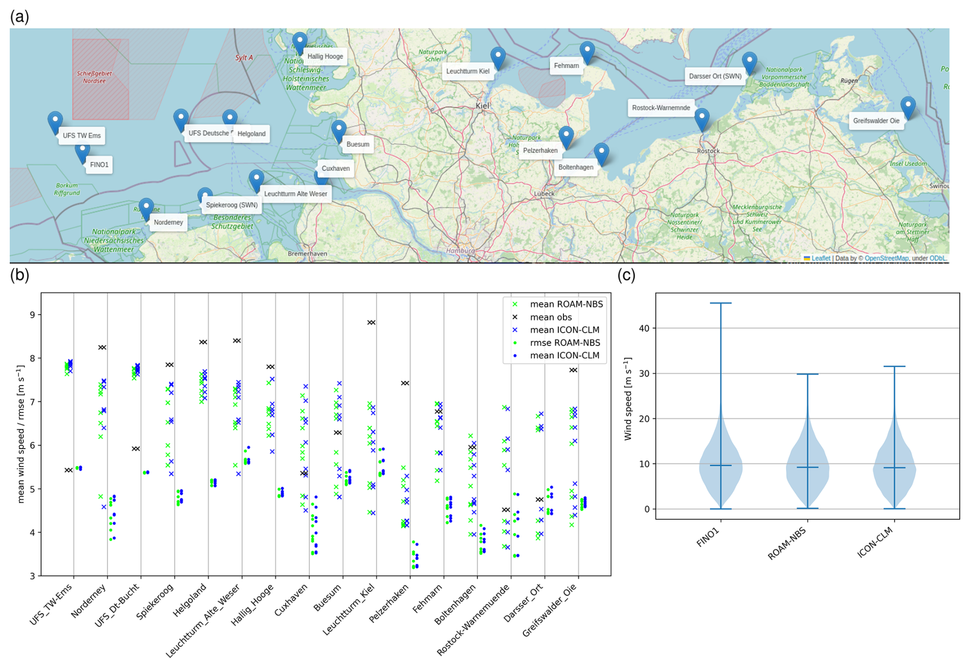 Figure 8Map with an overview of the evaluated station observations (a); mean station observations of hourly wind speed for 2011–2020, mean values and root-mean squared errors (rmse) of 9 closest grid points for each station for ROAM-NBS and ICON-CLM (b); violinplot displaying median, minimum and maximum values of hourly wind data at 100 m height at FINO1 and at the closest grid points in ROAM-NBS and ICON-CLM, for the years 2004–2010 (c).