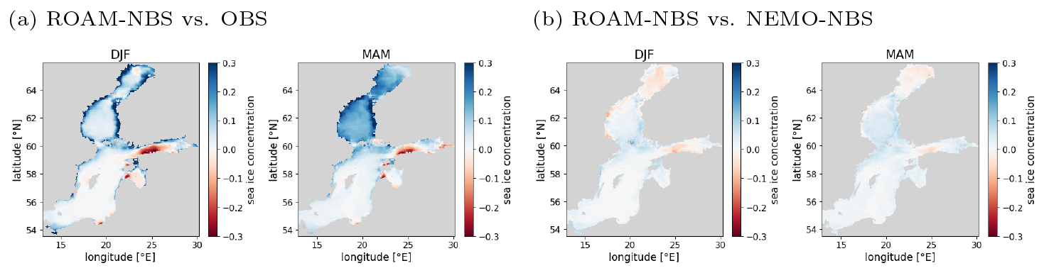 The bias of ROAM-NBS and NEMO-NBS against the Copernicus observations for the winter season (DJF) is small (Fig. 9a), and the difference between ROAM-NBS and NEMO-NBS is negligible (Fig. 9b). Nevertheless, in the spring season (MAM), the amplification of sea ice extent is prominent in the Gulf of Bothnia. While the start of the ice growth season and the growth rate in the end of December are well captured, the sea ice extent is overestimated during the peak later in winter (February-March) by both simulations (mean annual time series of sea ice extent not shown). Furthermore, the sea ice season is prolonged towards May compared to the observations. The overestimation of sea ice concentration as well as extent in MAM might originate from the prevailing negative bias in SST in the Bothnian Bay and Sea during winter and spring (Fig. 2 and the temperature profile for DJF at SMHISR5C4 station in Fig. 10) and an underestimation of salinity, especially in the Gulf of Bothnia (see the next subsection). Further, in Nie et al. (2023), the NEMO-SI3 model for version 4.0 was found to be most sensitive to the ice–ocean and atmosphere–ice drag coefficients and, therefore, to ice dynamics. Since only thermodynamical processes are modeled within ROAM-NBS and NEMO-NBS, further enhancements in results could be obtained by also considering ice dynamics. First tests with ice dynamics did not improve the overestimation of sea ice in spring. They will need to be carried out in the future in combination with further parameter tuning and recalibration to eliminate the temperature and salinity bias in the Northern Baltic.