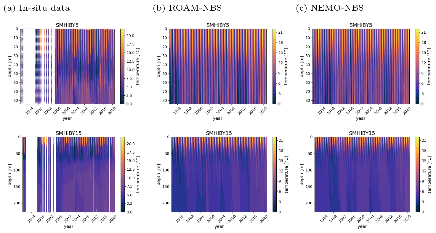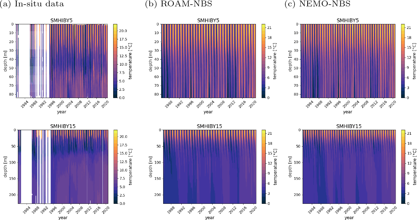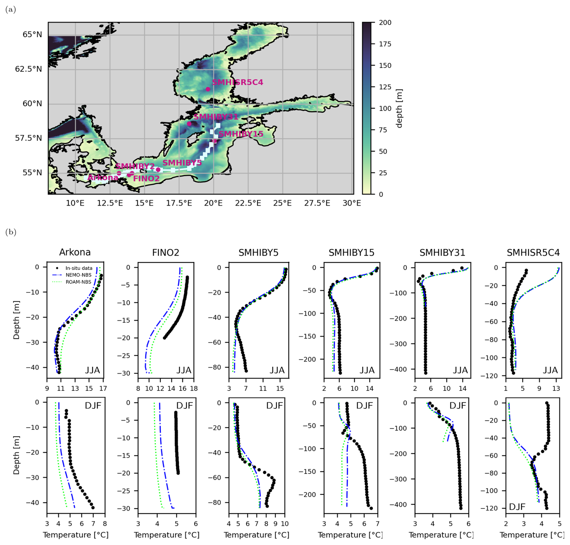 In addition to the SST evaluation in Sect. 3.1, the evolution of temperature in different depths over time and mean temperature profiles are compared against observational profiles for the ROAM-NBS and NEMO-NBS simulations to evaluate the stratification of the Baltic. The chosen stations, resembling those of Meier (2007), cover the main basins of the Baltic Sea and are displayed in Fig. 10a. The observational data are in-situ profile data from Copernicus. The seasonal mean is calculated over all time instances between January 1979 and December 2020 where the observational data exist.