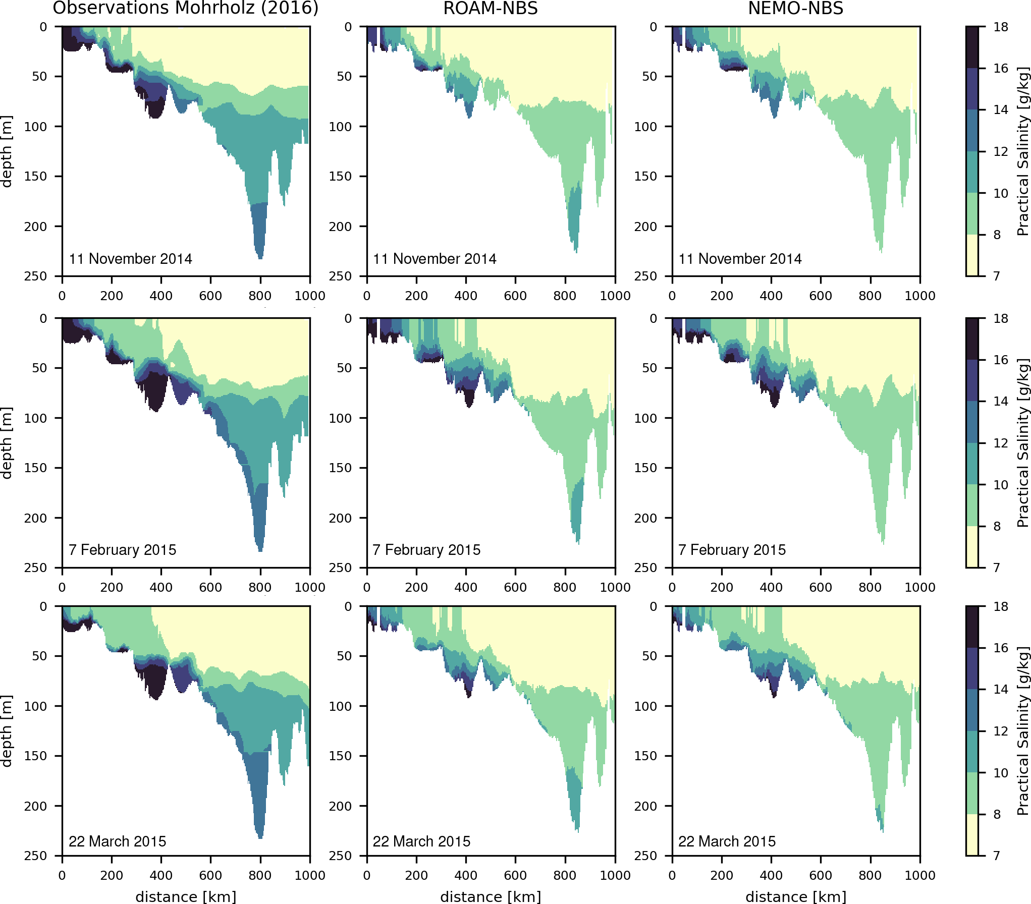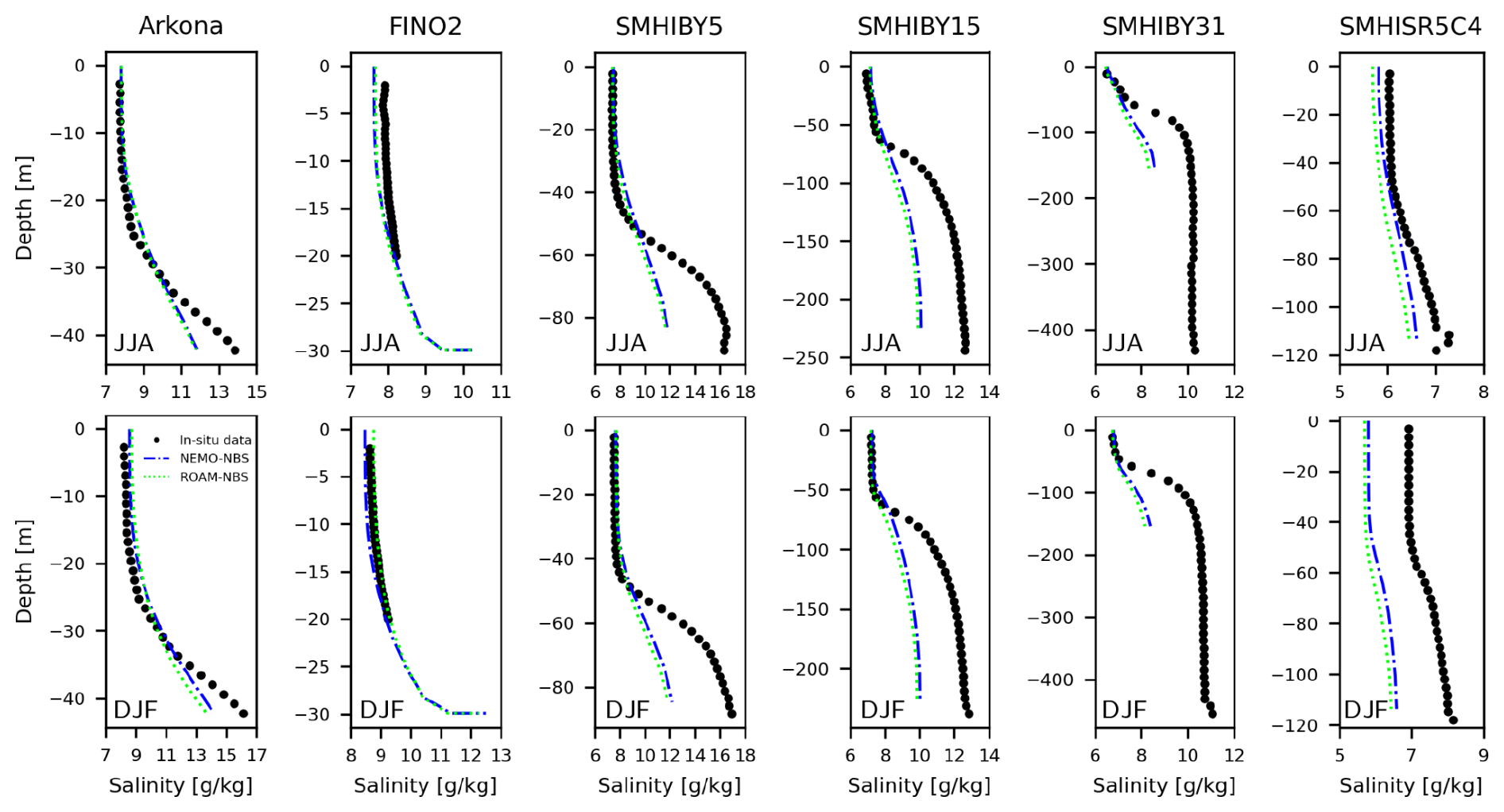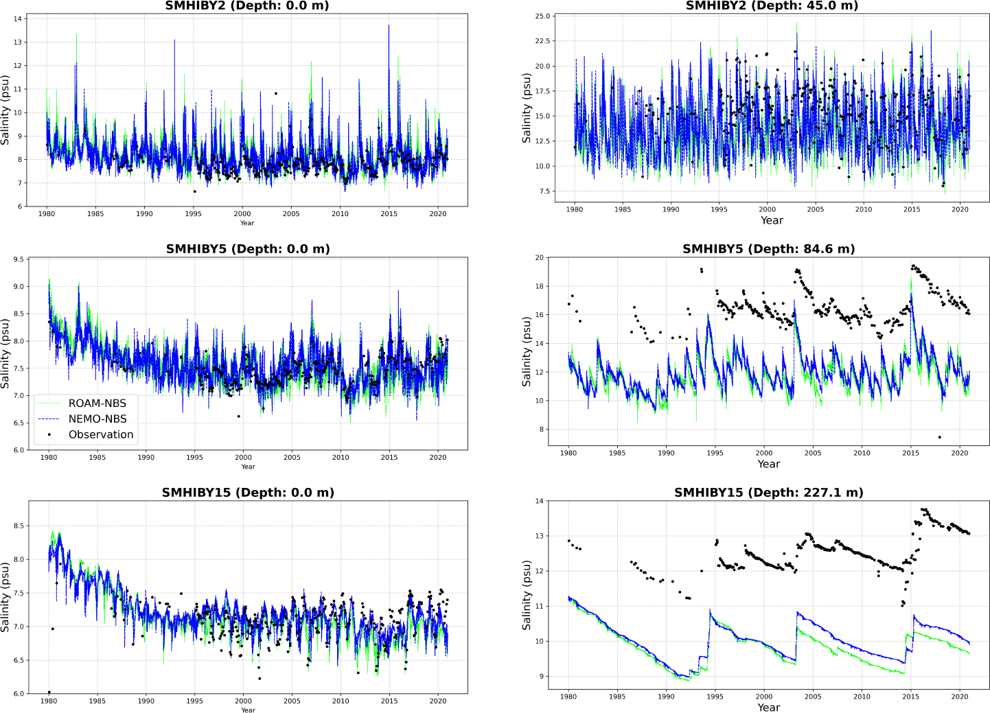 Time series of surface and bottom salinity at stations SMHIBY2, SMHIBY5, and SMHIBY15 are shown in Fig. A6, illustrating the temporal variability at each site. Both models underestimate the salinity in deeper layers but fit observations in upper layers. The surface salinity biases derived from the time series (Fig. A6) range between 0.17 and 0.37 psu for NEMO-NBS, and between 0.05 and 0.41 psu for ROAM-NBS. At the bottom, the biases are more pronounced, spanning from −1.55 psu at SMHIBY2 to −4.38 psu at SMHIBY15 for NEMO-NBS, and from −1.87 psu at SMHIBY2 to −4.64 psu at SMHIBY15 for ROAM-NBS. The representation of the stratification of the Baltic Sea is further analyzed with seasonal mean profiles (Fig. 12) as well as sections through the Baltic in Sect. 4.1. Stratification is underestimated at stations SMHIBY5, SMHIBY15, and SMHIBY31 (Fig. 12). Enhancing its representation is essential for reliable coupling with biogeochemical models and for achieving accurate results. As an example, one Major Baltic inflow (MBI) event (2014) is chosen for the comparison between observations and simulations. The MBI is reproduced but underestimated at both stations.