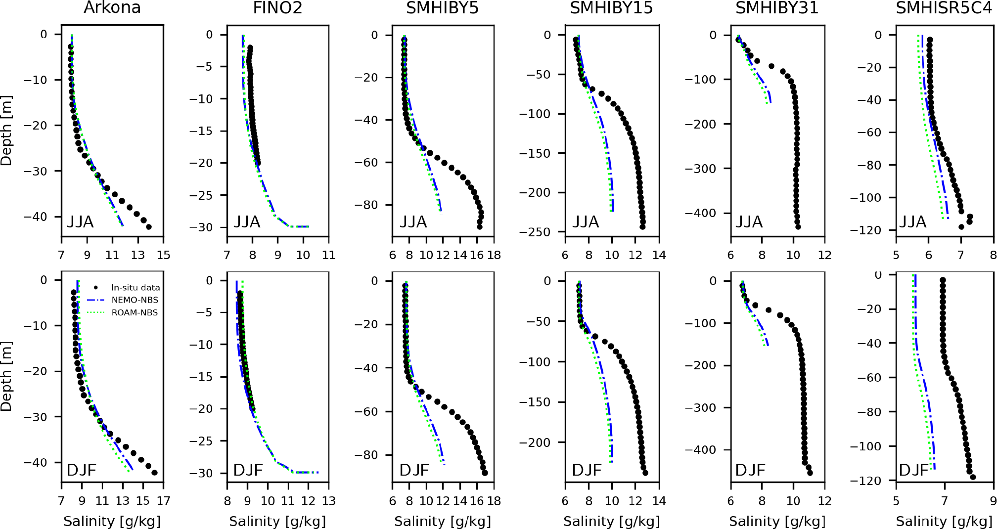 The mean salinity profiles between 1979 and 2020 indicate an underestimation of salinity in the deep areas of both simulations (SMHIBY15, SMHIBY5, SMHIBY31, Fig. 12). The surface salinity is well represented at these locations by both ROAM-NBS and NEMO-NBS. This behavior is consistent throughout all seasons. At Arkona and FINO2 (Fig. 12), model results highly coincide with the mean observational salinity profiles. At FINO2, model results align well with observations in winter and autumn, while a minor fresh bias near the surface is observed during summer. In the Gulf of Bothnia (SMHISR5C4), both simulations show a fresh bias, which is slightly smaller for the NEMO-NBS stand-alone run than for ROAM-NBS. Seasonal profiles indicate that the fresh bias in the Gulf of Bothnia is mainly driven by the winter months. The discrepancy may result from the fact that neither observational nor model data were masked to account for existing ice during this period. Overall, an underestimation of bottom salinity in deeper Baltic basins can be observed. This underestimation could be mitigated in future simulations by employing longer spin-up periods or improved initial conditions. Additionally, efforts should focus on refining vertical and horizontal mixing within the Baltic and increasing spatial resolution in the Danish Straits. For climate projections based on the current setup, bias correction of bottom salinity values in basins deeper than 40 m is necessary.
