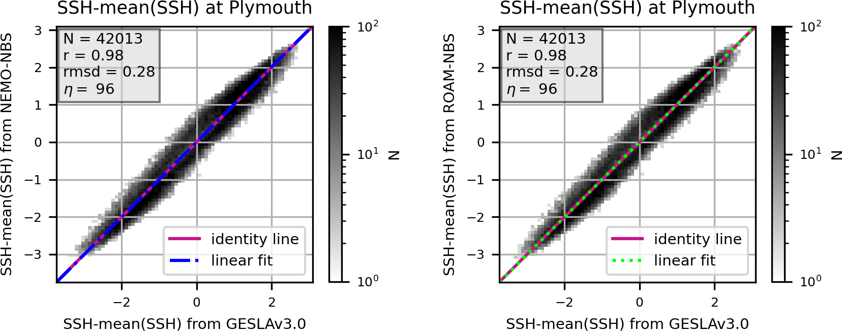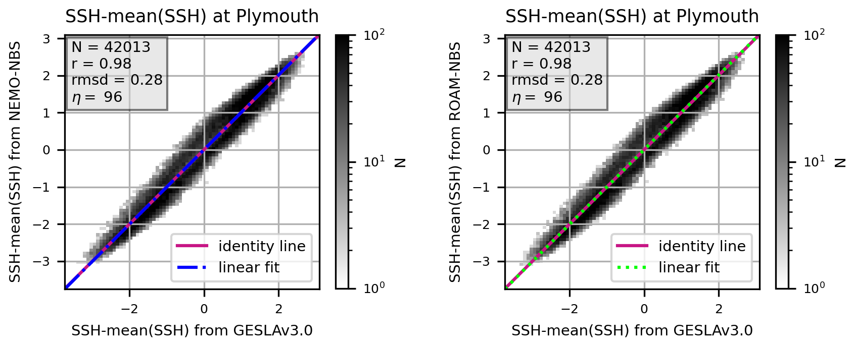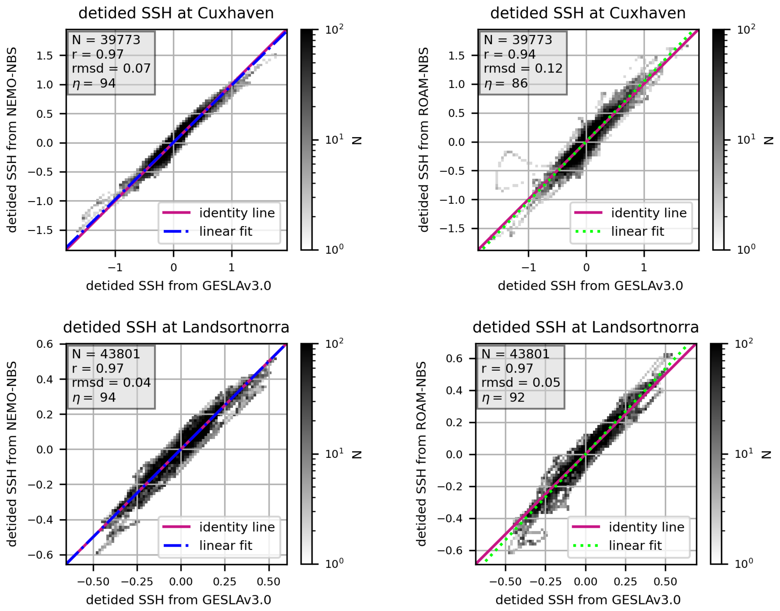 Figure 13Comparison of scatter plots of detided sea surface heights at selected stations in the North Sea and Baltic for NEMO-NBS (left panels) vs. ROAM-NBS (right panels).