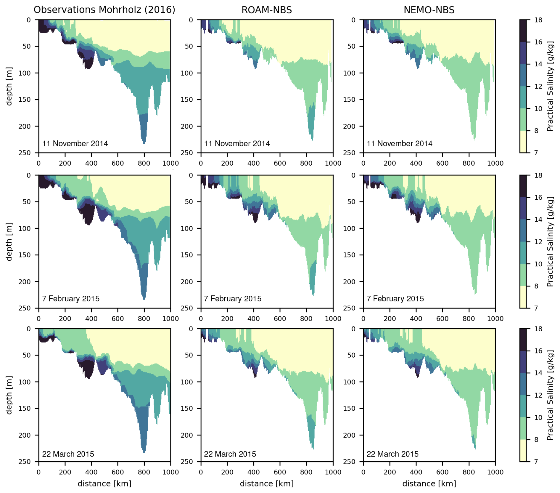 The model sea surface salinity is validated against an interpolated level-4 analysis of the sea surface salinity based on in-situ and satellite observations from Copernicus. The winter and summer differences between the simulated mean sea surface salinity of ROAM-NBS and observations for the period December 1993–November 2020 are shown in Fig. 11. These years were chosen as the observational dataset is only available for this period (Table 2). The sea surface salinity tends to be underestimated at the Norwegian and German coasts and the Baltic Sea and tends to be overestimated at the passage from the Baltic Sea to the North Sea. However, both models, ROAM-NBS and NEMO-NBS, show very similar results (Fig. 11). Since the pattern at the coasts seems to be quite constant throughout the year, the cause may originate from a prescribed inflow of fresh water that is too strong. Within the current NEMO-NBS and ROAM-NBS simulations, the runoff is prescribed only in the upper layer. A prescription over the complete water column and additional vertical mixing could better distribute the fresh water from the rivers and further enhance the sea surface salinity results. The underestimation of the salinity in the Baltic Basin may be the result of the general underestimation of the salinity inflow from the North Sea.