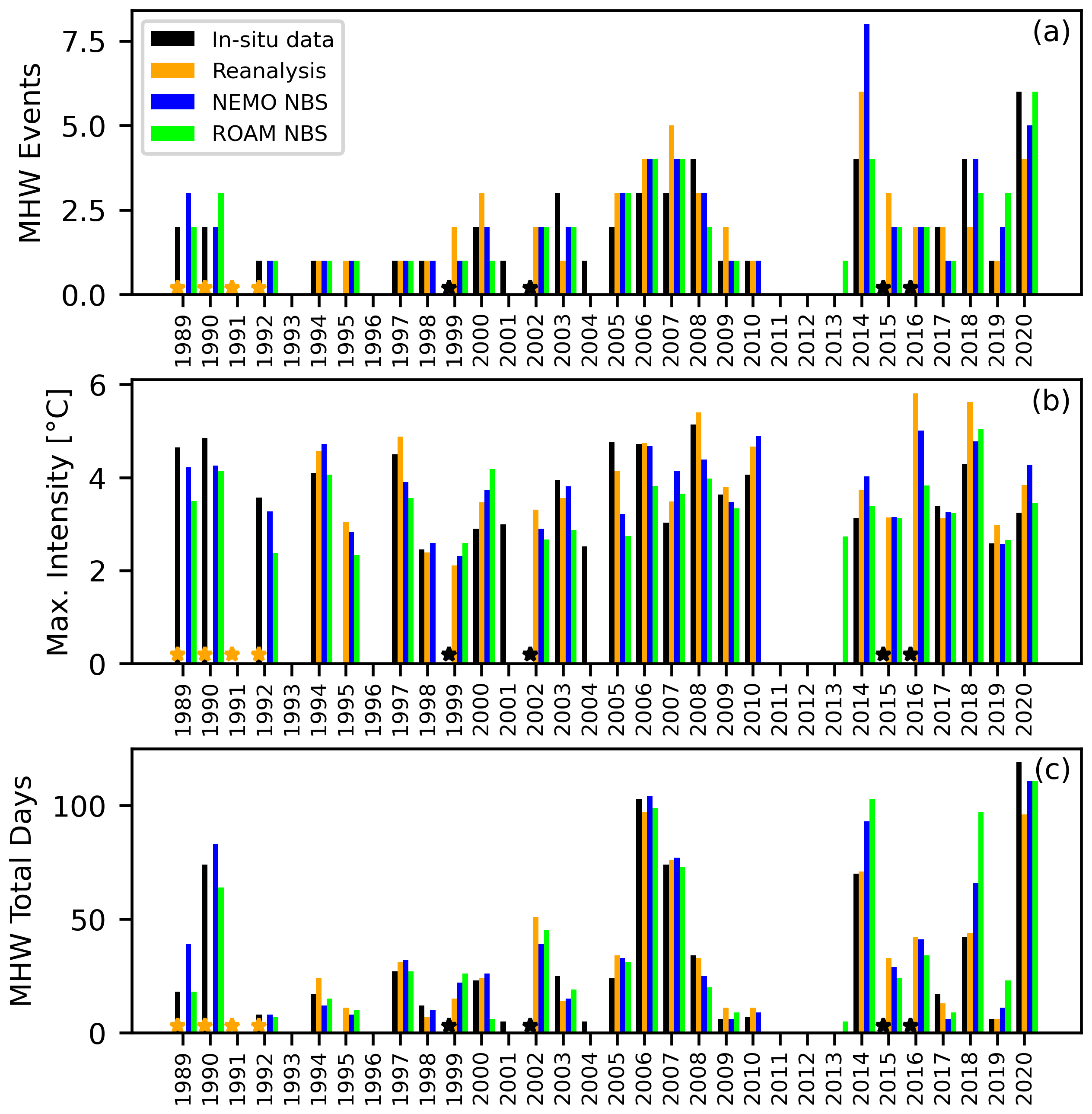 The evaluation simulation was run for the coupled model (ROAM-NBS) and for both the atmospheric and ocean components individually (ICON-CLM and NEMO-NBS, respectively); i.e., we are overall evaluating and comparing three simulations. In Sect. 3.2.1, a basic comparison to the evaluation simulation from the UDAG project (called ICON-CLM-UDAG) is additionally shown. According to CORDEX specifications (CORDEX, 2025), “the evaluation experiment must cover at least the 1979–2020 period”. Our experiments were started in September 1978 because of the stable thermal mixed layer in the ocean. Starting in January would mean starting in the middle of the winter season when thermal conditions are unstable and the sea ice has already evolved, which has proven disadvantageous for model initialization, especially in coupled mode. To avoid a so-called “cold start”, a spin-up for the ocean component was carried out with NEMO-NBS for the years 1974–1978, starting with an initial field for temperature and salinity. This initial field was, in turn, a combined product from the ORAS5 reanalysis and the Baltic reanalysis product provided by SMHI (personal communication) based on Hordoir et al. (2019). The restart field for 1 September 1978 from the spin-up simulation with NEMO-NBS was then used to start ROAM-NBS.