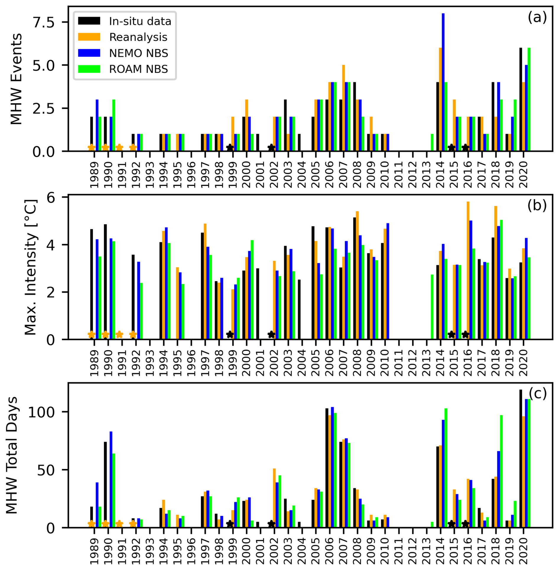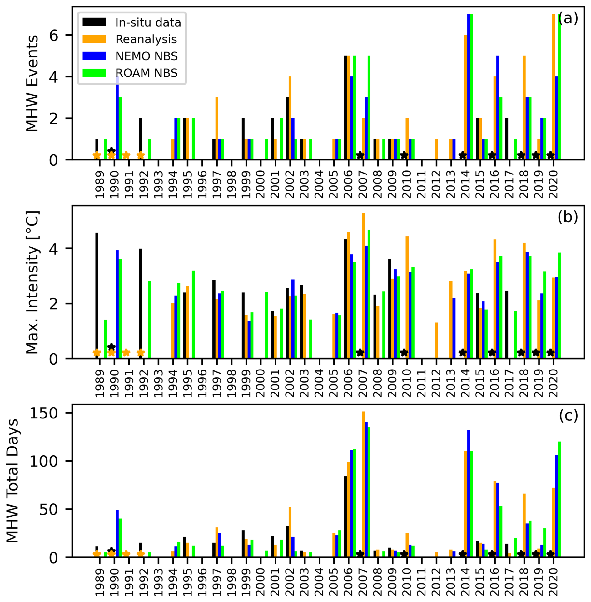 Using ROAM-NBS and different configurations of GCOAST-AHOI described by Ho-Hagemann et al. (2020, 2024), which all employ an online coupled ocean for the NBS region, CMIP6 climate projections will be downscaled for the EURO-CORDEX region (Jacob et al., 2014). These coupled regional climate projections will complement the RCM simulations of CORDEX-CMIP6 (https://github.com/WCRP-CORDEX; last access: 23 May 2025). The simulation status is updated regularly and can be viewed at https://wcrp-cordex.github.io/simulation-status/CORDEX_CMIP6_status.html#EUR-12 (last access: 23 May 2025). The evaluation simulation analyzed in this article defines the setup of ROAM-NBS that will be used for downscaling. In addition to publishing the data on the ESGF nodes within the EURO-CORDEX community, ROAM-NBS will be applied to generate an ensemble of climate projections that can be used for climate adaptation measures in German national waters. Related evaluations will be published on https://das.bsh.de (last access: 9 July 2025).