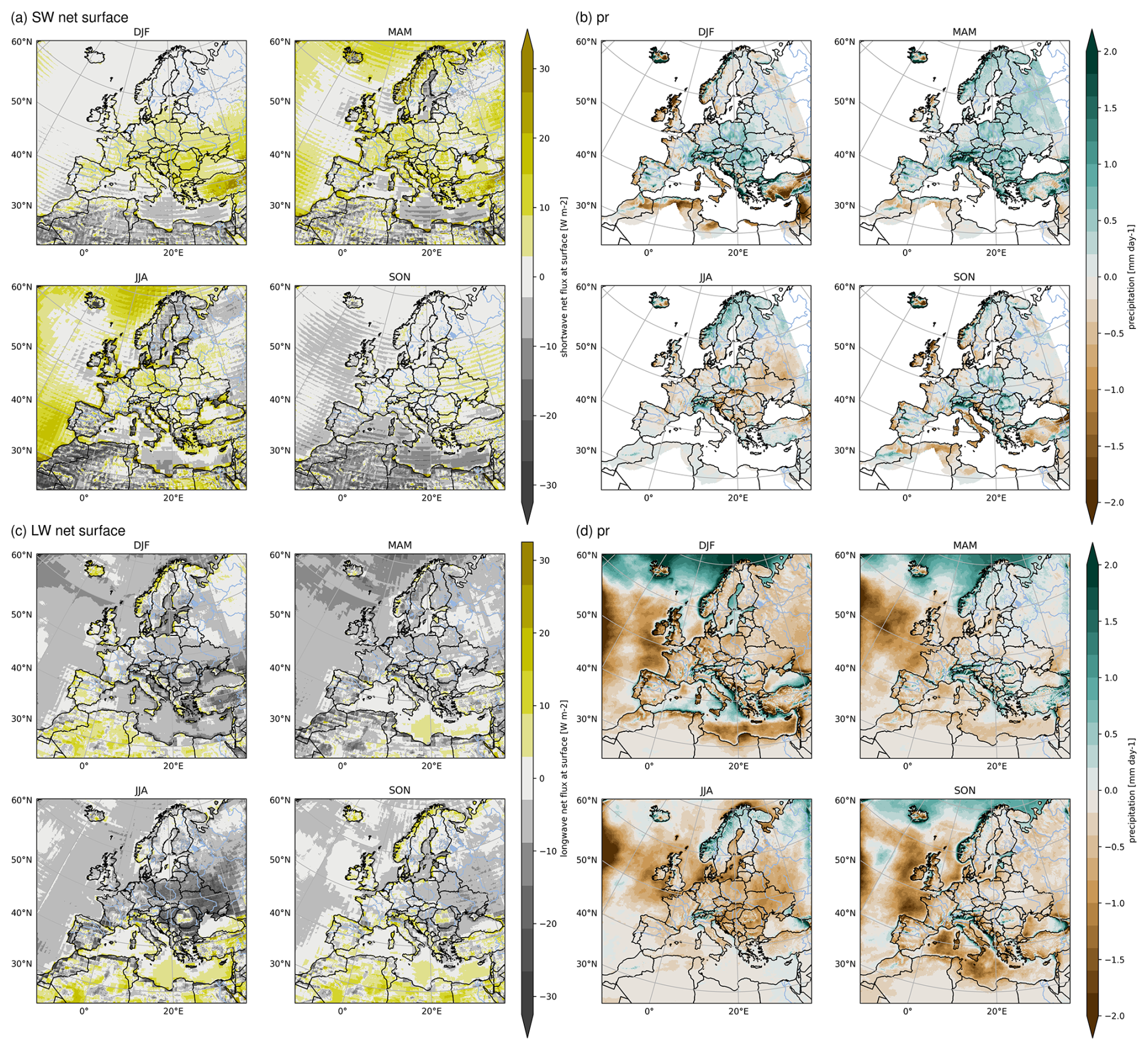 For precipitation, the differences between ROAM-NBS and ICON-CLM reflect the differences in evaporation or latent heat flux (hfls) over the ocean (Fig. 6): Precipitation over the ocean is higher by up to 0.15 mm d−1 in ROAM-NBS in regions where evaporation is higher, such as over the Atlantic ocean and North Sea in summer or the Baltic Sea in winter. Vice versa, precipitation is lower by up to −0.15 mm d−1 when evaporation is lower, as over the Atlantic ocean and the North Sea in summer. However, these differences are small compared to the absolute precipitation biases over land, which exceed ±0.6 mm d−1 in various regions (Fig. A1b and d; note the adapted color scale compared to Fig. 6).